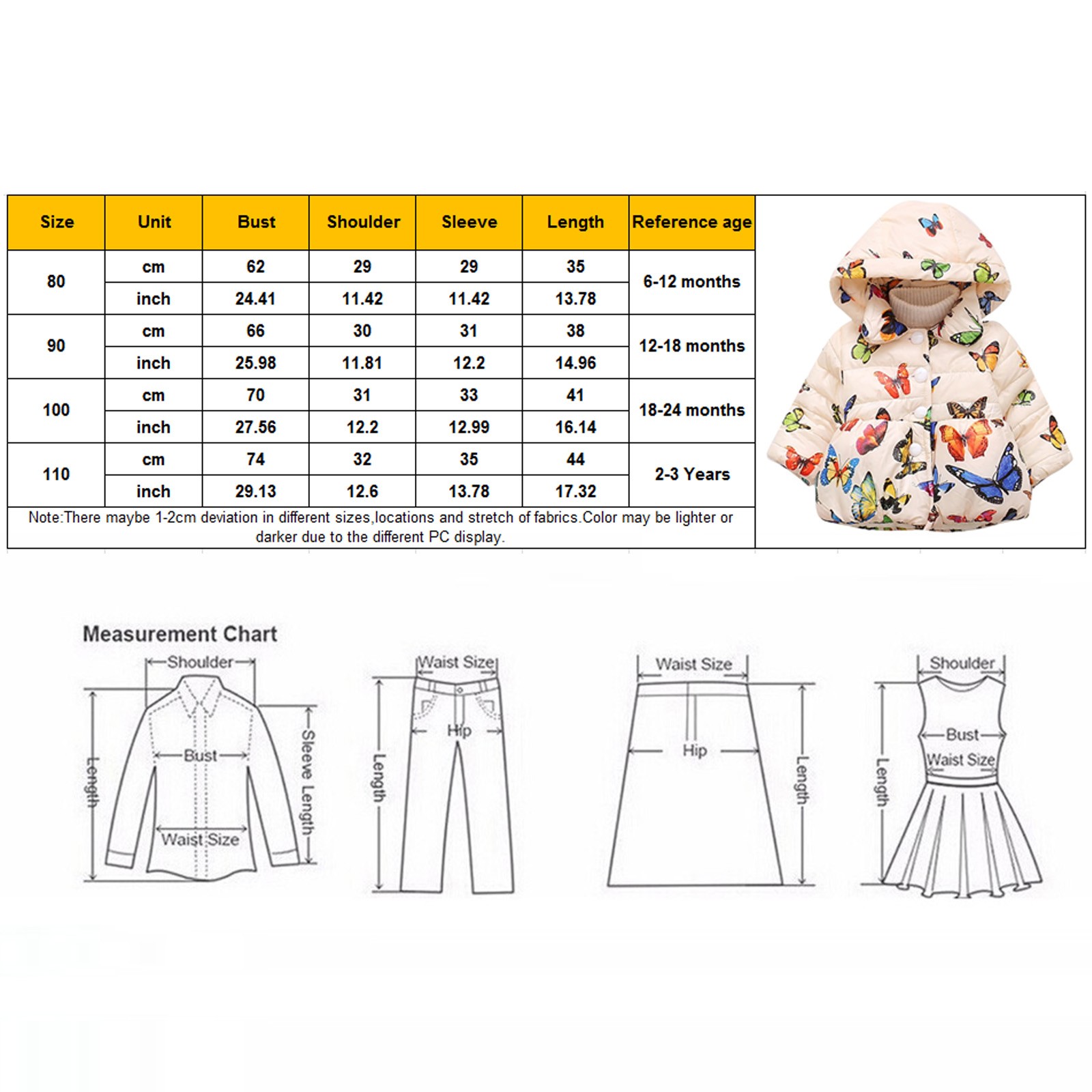 Размеры Рекомендуемый возраст Бюст Плечо Рукав Длина 80 6-12 месяцев 62 см/24,41'' 29 см/11,42'' 29 см/11,42'' 35 см/13,78'' 90 12-18 месяцев 66 см/25,98'' 30 см/11,81'' 31 см/12,20'' 38 см/14,96'' 100 18-24 месяцев 70 см/27,56'' 31 см/12,20'' 33 см/12,99'' 41 см/16,14'' 110 От 2 до 3 лет 74 см/29,13'' 32 см/12,60'' 35 см/13,78'' 44 см/17,32''