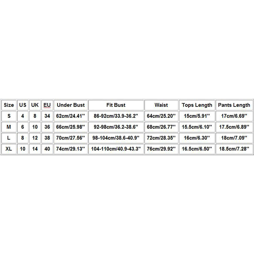 Размеры США Великобритания ЕС Под грудью Подходит для бюста Талия Длина топа Длина брюк S 4 8 34 62 см/24,41'' 86-92 см/33,9-36,2" 64 см/25,20'' 15 см/5,91'' 17 см/6,69'' М 6 10 36 66 см/25,98'' 92-98 см/36,2-38,6" 68 см/26,77'' 15,5 см/6,10'' 17,5 см/6,89'' L 8 12 38 70 см/27,56'' 98-104 см/38,6-40,9" 72 см/28,35'' 16 см/6,30'' 18 см/7,09'' XL 10 14 40 74 см/29,13'' 104-110 см/40,9-43,3" 76 см/29,92'' 16,5 см/6,50'' 18,5 см/7,28''