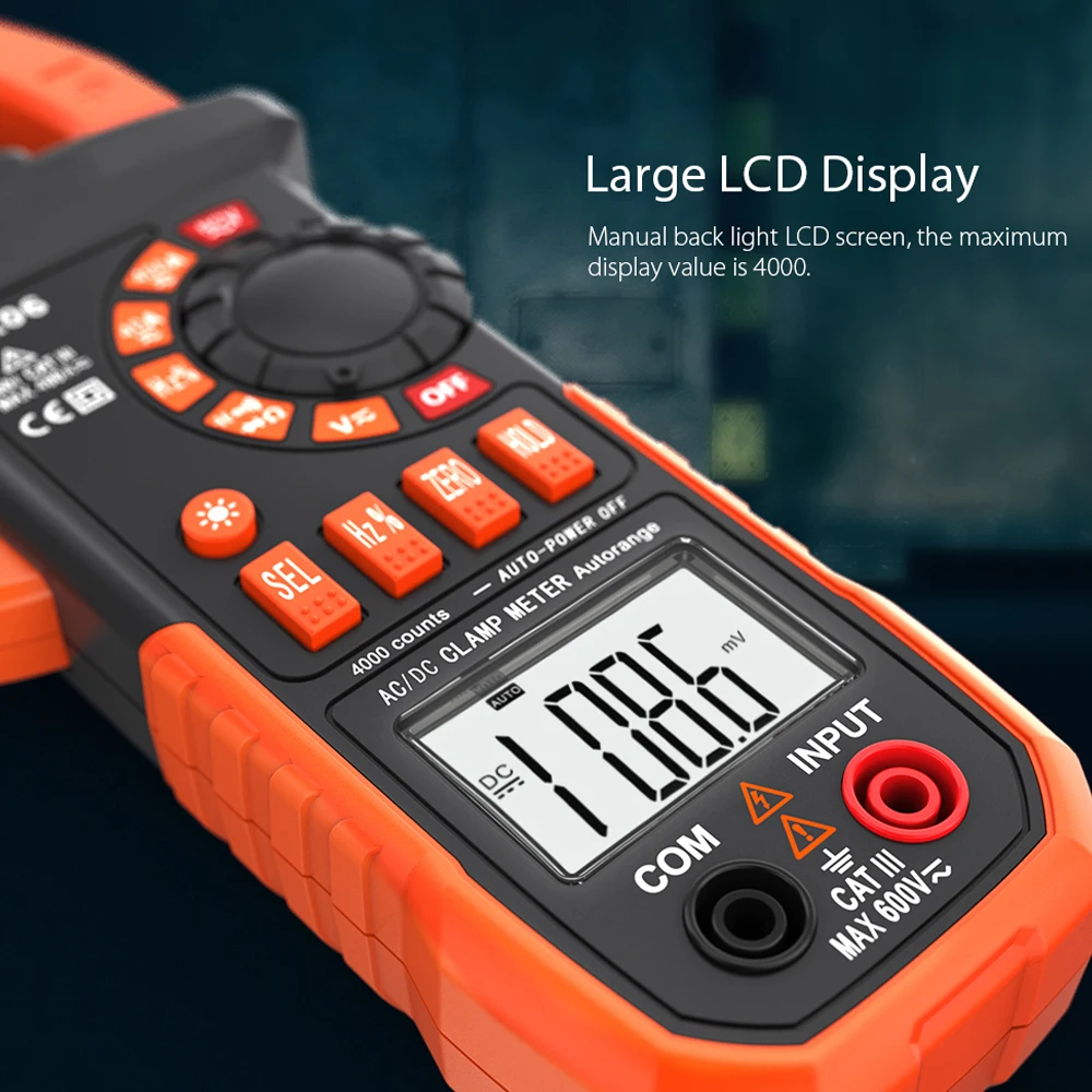 Многоцелевой клещи с автоматическим диапазоном: может точно измерять напряжение переменного/постоянного тока, ток переменного/постоянного тока, частоту, рабочий цикл, диод, емкость и измерение сопротивления.