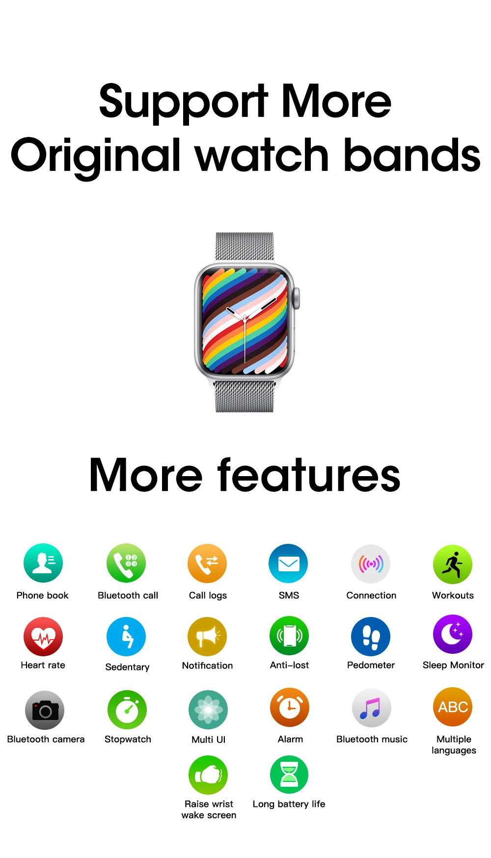 Основные характеристики: загрузка циферблатов, Разделенный экран, блокировка контактов, вызов Bluetooth, частота сердечных сокращений, шагомер, несколько видов спорта, уведомления