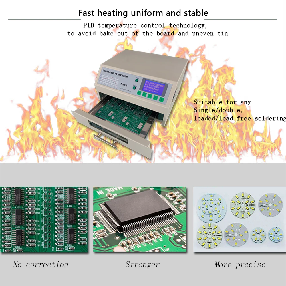 3. Специальный нагрев и выравнивание температуры со всеми дизайнами. Использует до 800 ватт энергоэффективного инфракрасного нагрева и продувки воздуха для повторного потока припоя.