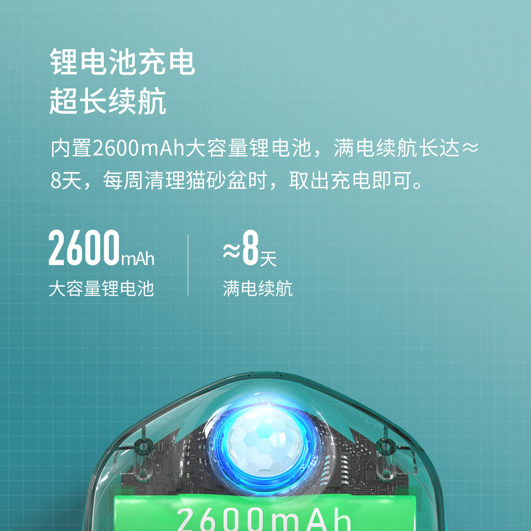 Встроенный литий-ионный аккумулятор большой емкости 2600 мАч, полный срок службы батареи до 10 дней. При чистке ящика для мусора каждую неделю просто вынимайте его и заряжайте.