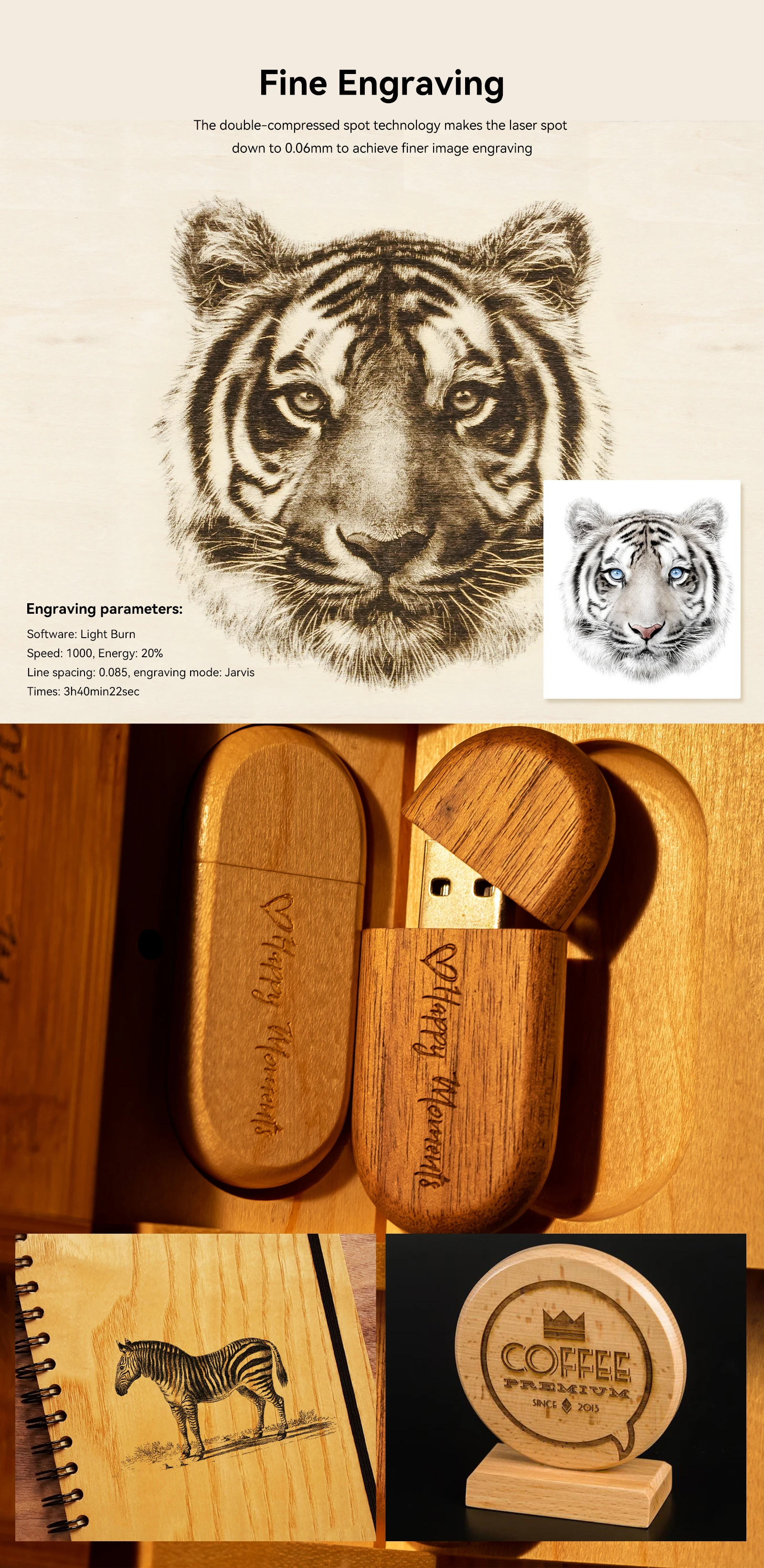 Новый модернизированный ультра-тонкий сжатия лазера: лазер принимает 4 раза группы линз коллизацией и технология фокуса, оптическая мощность составляет 5-5,5 W, И лазерный фокус участке снижается до 0,08*0,08 мм. Лазер высокой плотности может легко отрезать 20 мм толстые деревянные доски, 15 мм черный акрил; Может непосредственно гравировать зеркало из нержавеющей стали металла и керамики, И может достичь эффекта 100 Вт CO₂ лазерная гравировальная машина.
