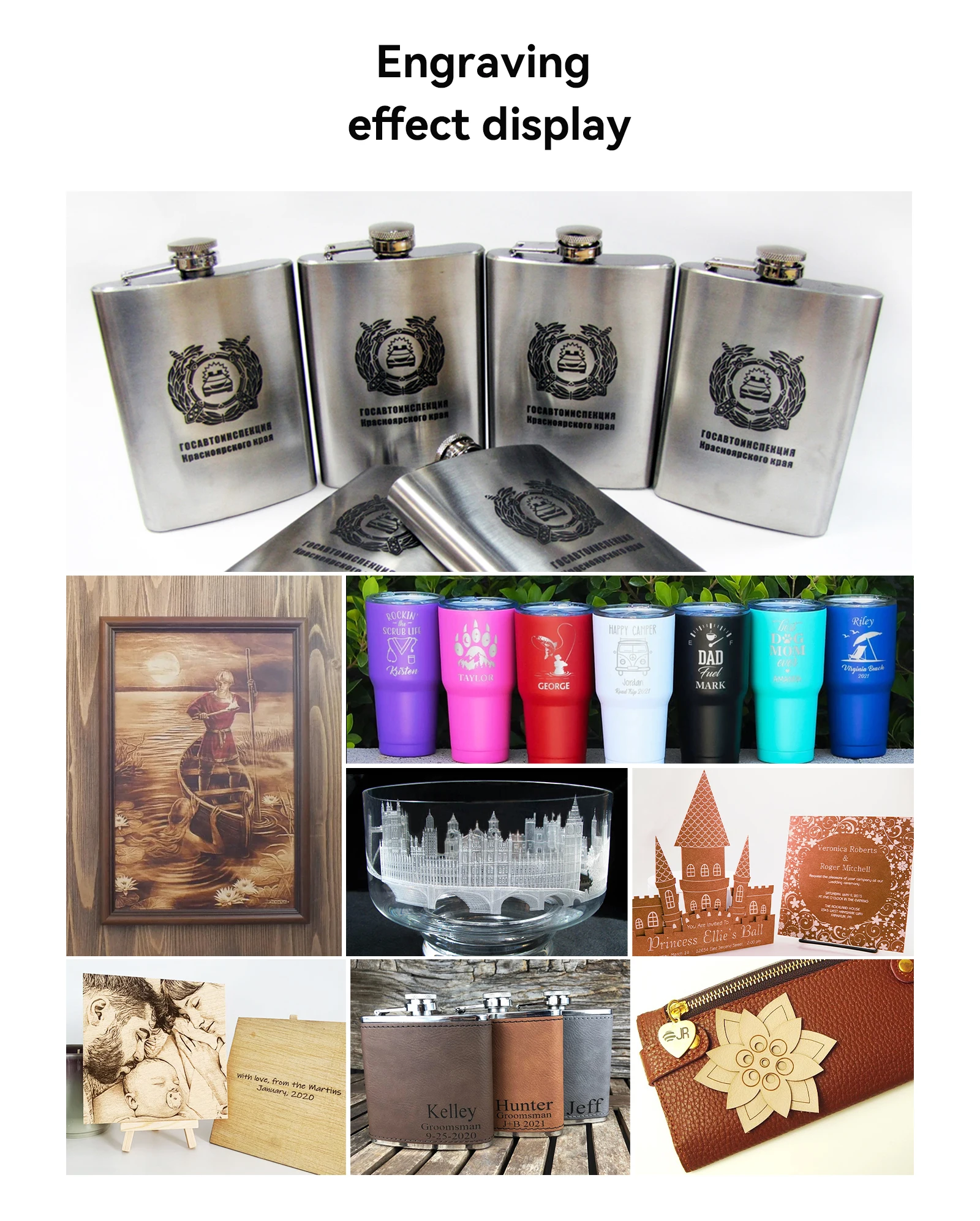 Дерево, бамбук, картон, пластик, кожа, МДФ, шифер, лакированный металл, зеркальная нержавеющая сталь;