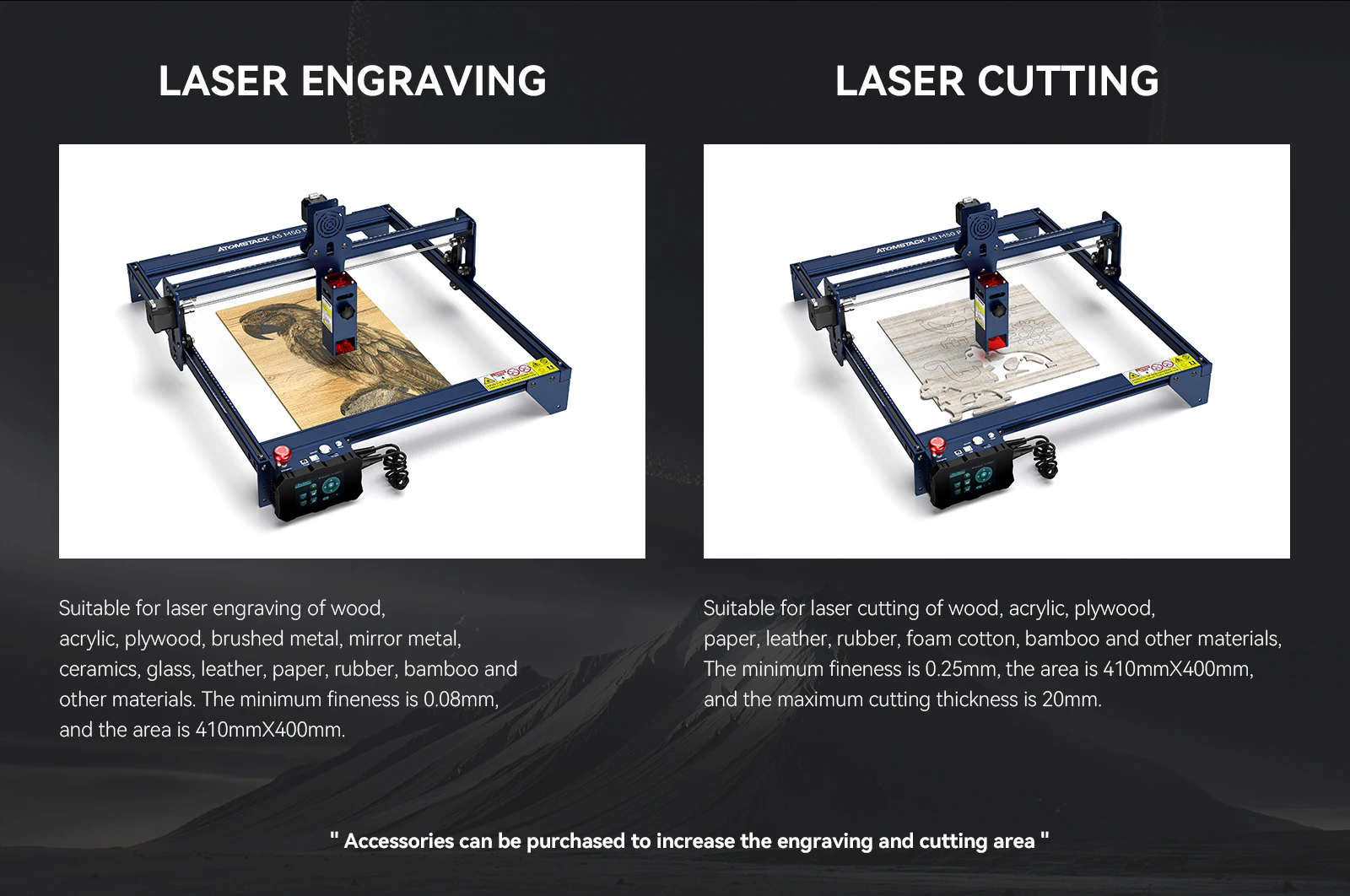 Есть точные масштабные линии на оси X и оси Y для облегчения быстрого измерения длины. 410x400 мм интервал гравировки большой площади может удовлетворить ваши различные потребности гравировки.