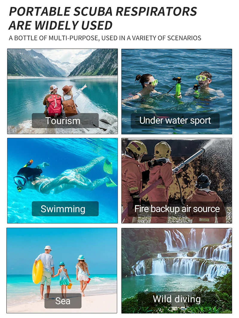 Цилиндрический цилиндр Chikadiv имеет емкость 1Л. Вы можете дышать под водой в течение 15-20 минут. (Вообще говоря, время использования варьируется от человека до человека)