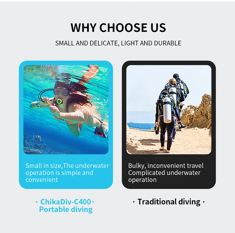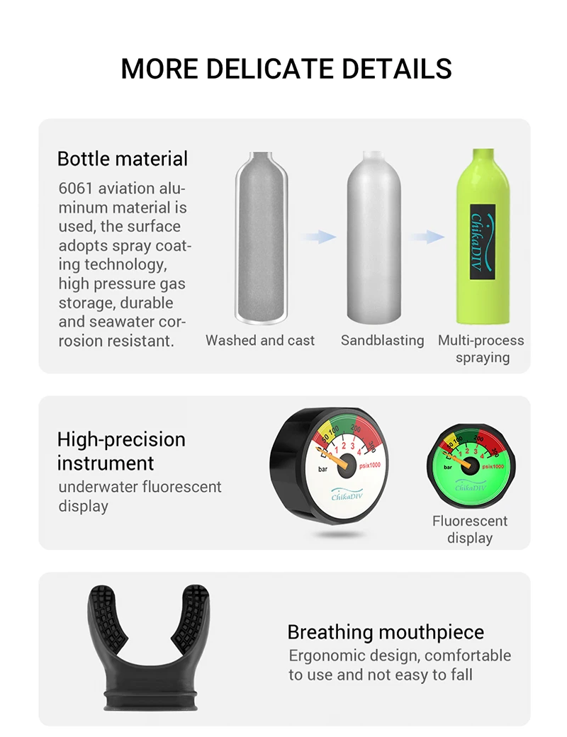 Chikadiv mini scuba tank использует клапан воздушного переключателя, который продлевает время хранения газа в герметичной упаковке. Конструкция клапана с постоянным давлением больше соотносится с нашей скоростью дыхания. Кроме того, взрывозащищенный клапан безопасен. Когда внутреннее давление превышает 5000PSI, оно будет автоматически выпускать, чтобы уменьшить давление.