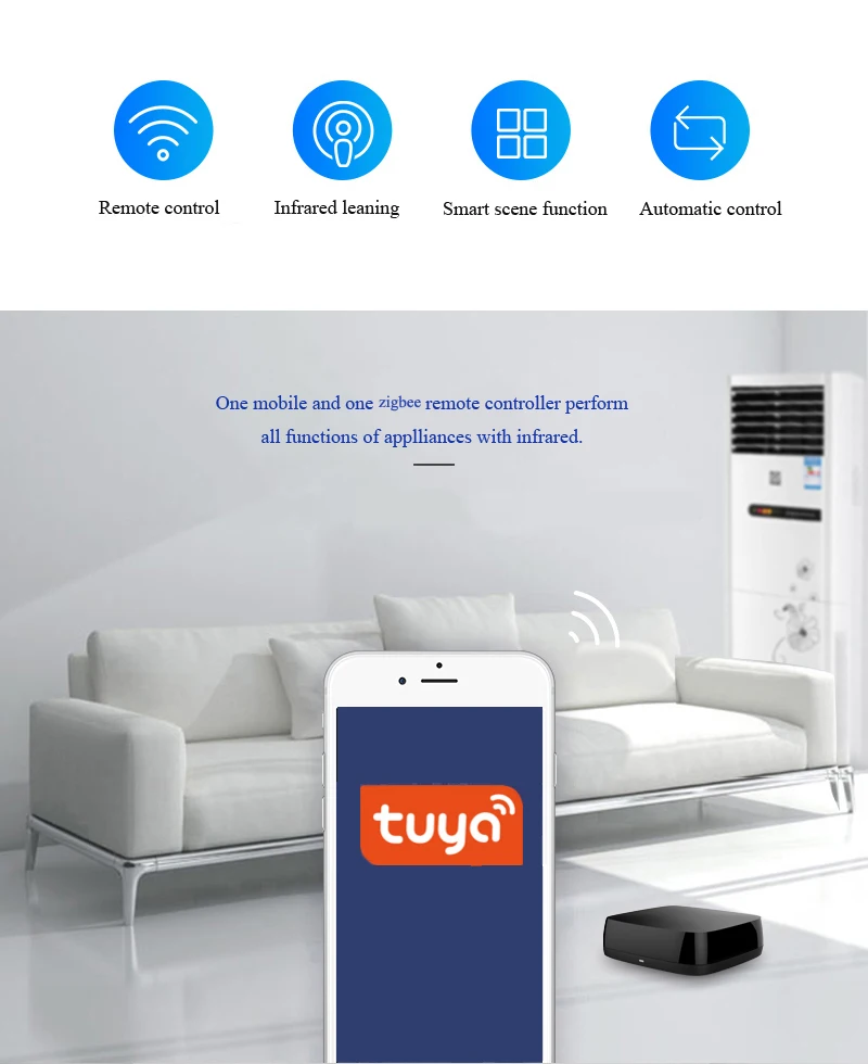 1.Control all the infrared remote (IR) controlled devices (TV, TV box, DVD, air conditioner) with App or voice anywhere at any time.