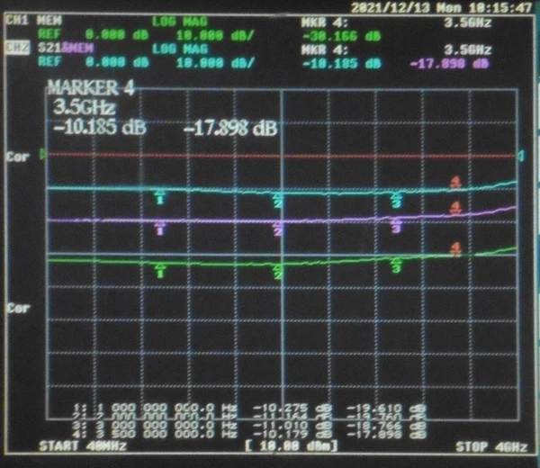 Диаграмма частотного отклика II (ширина развертки: 40 МГц ~ 4 ГГц, синяя линия-это контрольное напряжение 5Vdc, вносимая потеря, фиолетовая линия-это контрольное напряжение 2,2 VdcTime вносимые потери, зеленая линия управляющее напряжение 1,5 VdcTime пропуск частиц, вертикальный Масштаб: 10dBEach сетка):