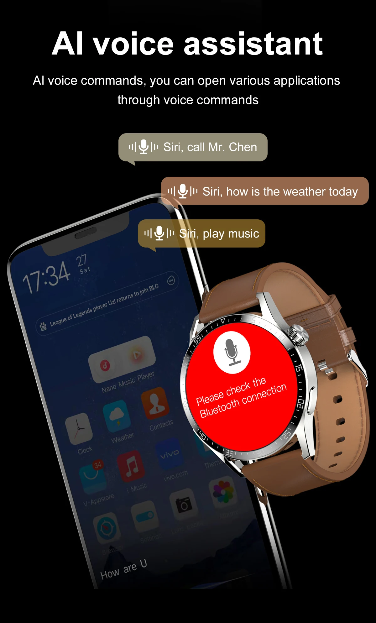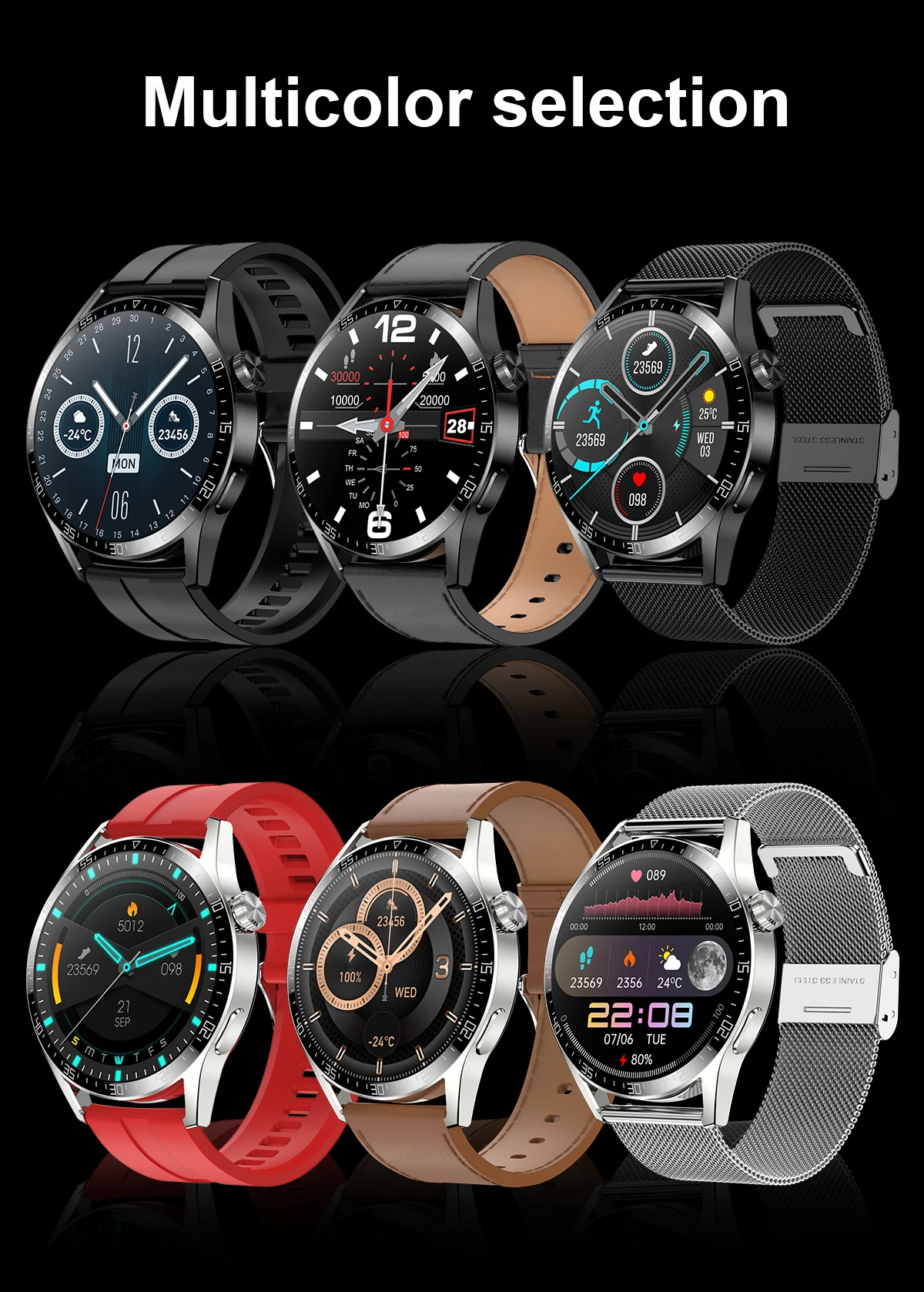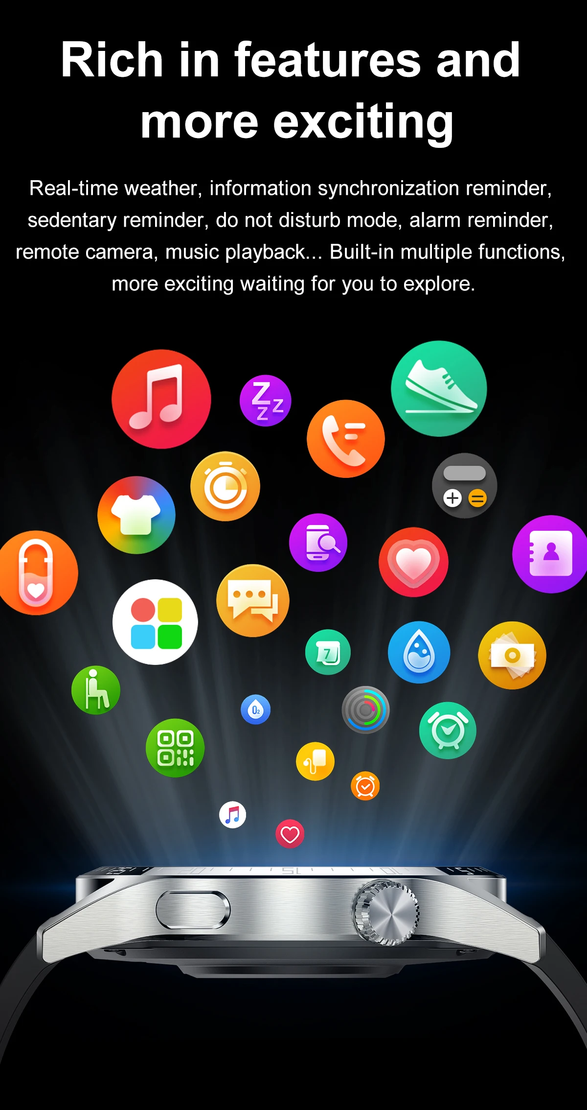 Сигнал тревоги, будильник, пульт дистанционного управления, функция "антипотеря, информация о погоде, управление музыкой, скалолазание, звонки звонок, запись звука, голосовой помощник, 12-созвездие циферблат, Поддержка NFC, лицевая сторона часов на заказ.