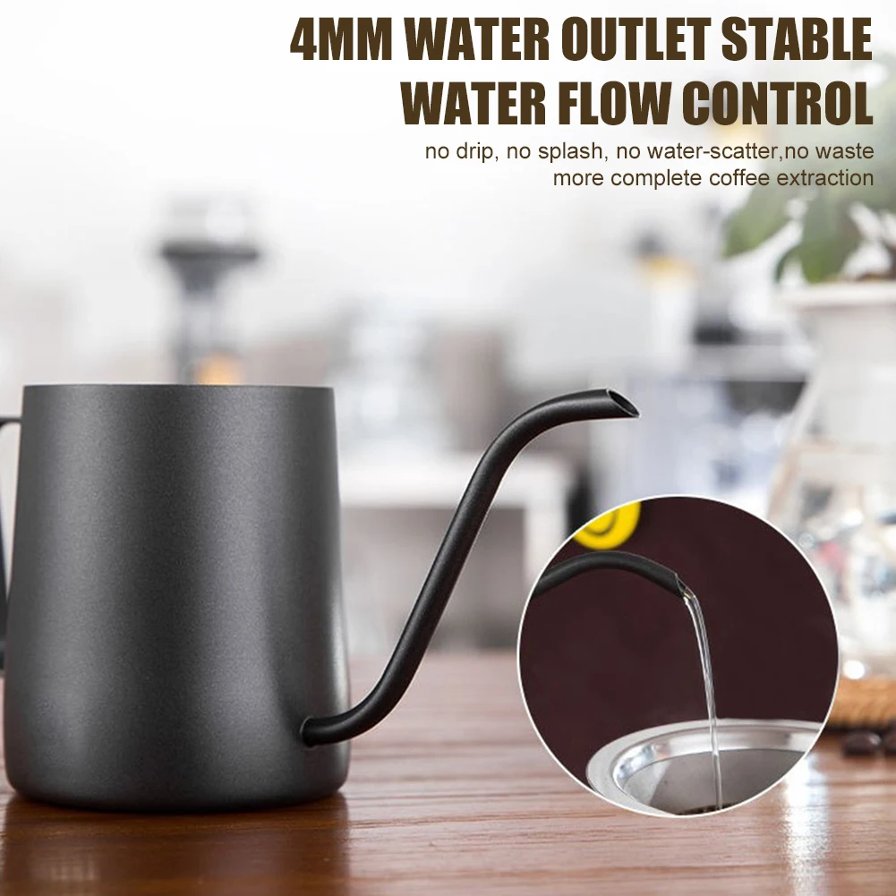 * 2. Кофейник принимает 4 мм выход воды для обеспечения точного и стабильного контроля воды, нет капель, нет брызг, нет брызг воды, нет отходов, обеспечивая более полное извлечение кофе, сохраняя оригинальный мягкий вкус кофе. Длинная узкая конструкция сопла гусиная шея обеспечивает даже заваривание кофейного порошка.