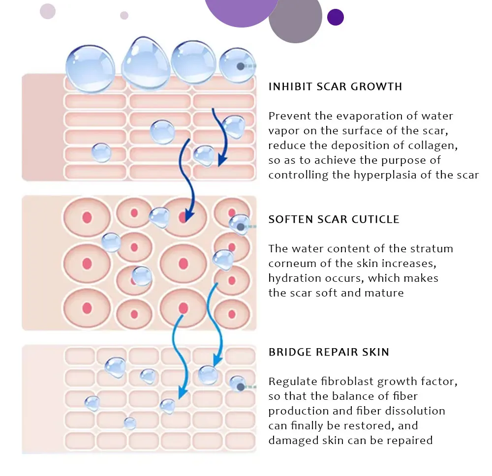 Предотвращает испарение водяного пара на поверхности рубца, уменьшает осаждение коллагена, чтобы достичь цели контроля гиперплазии рубца