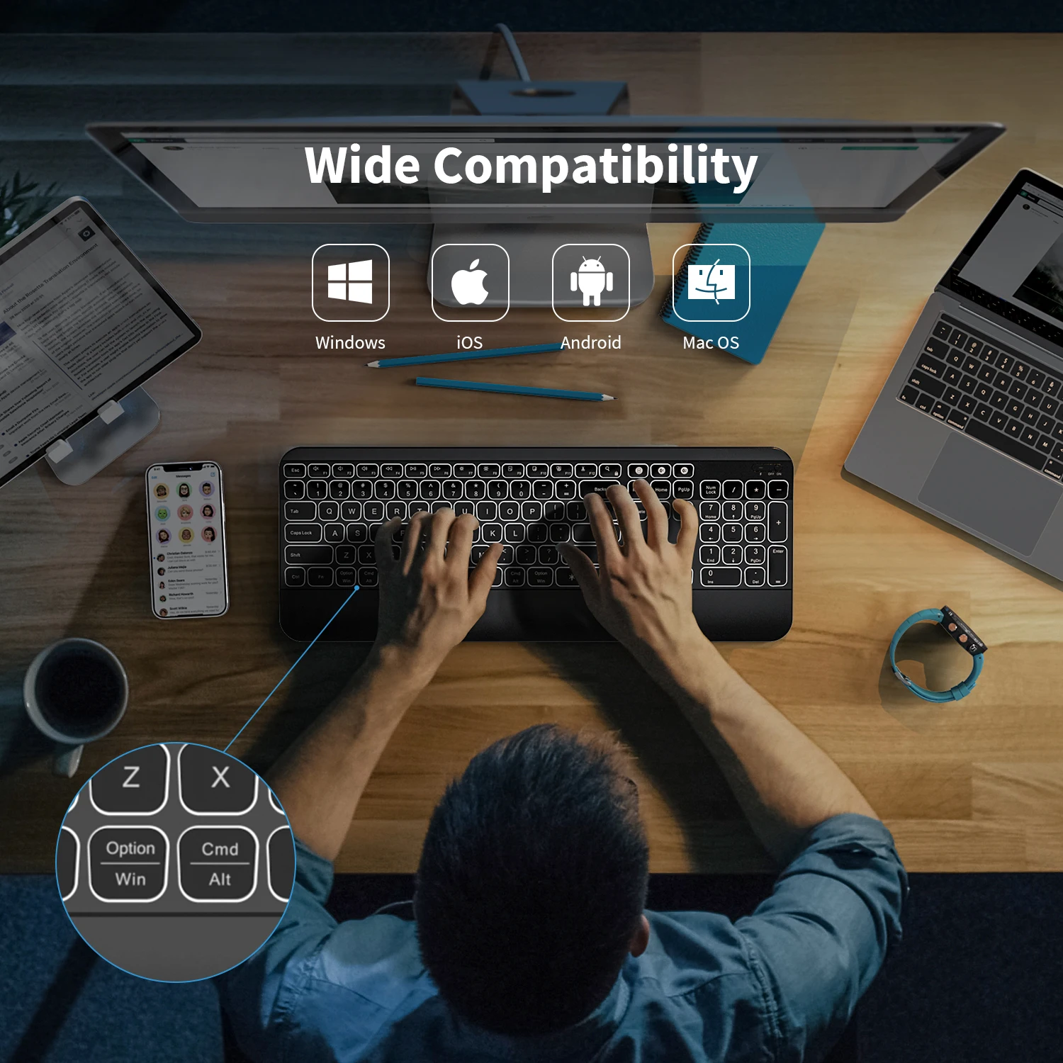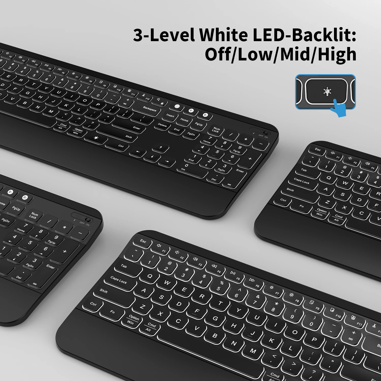 【 Беспроводной освещенная контржурным светом Keyboard】With Регулируемый 3-х уровневая белый светодиодный со светодиодной подсветкой, Беспроводной клавиатура может работать в темное время суток, без бликов для того, чтобы защитить ваши глаза. Подсветку можно включить и выключить.