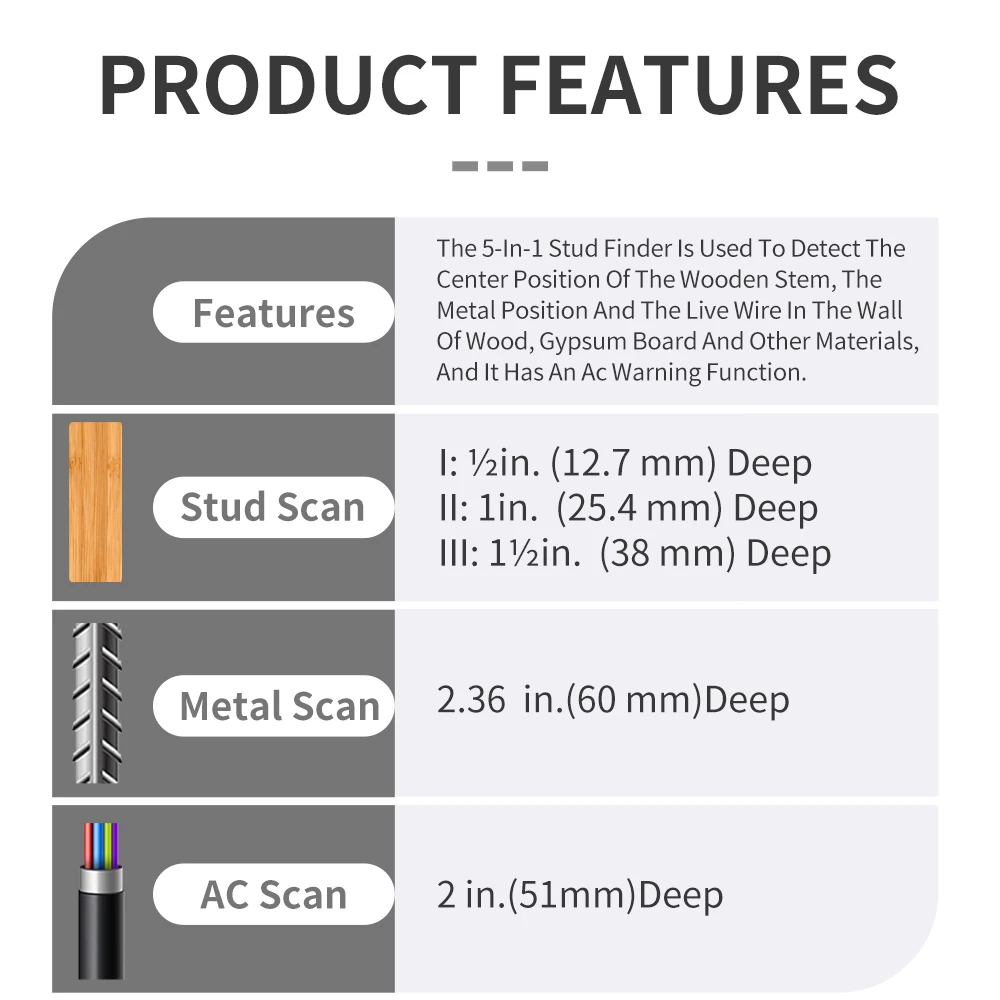 Обнаружение глубины 5 в 1: у этого детектора стержней есть 5 режимов сканирования.