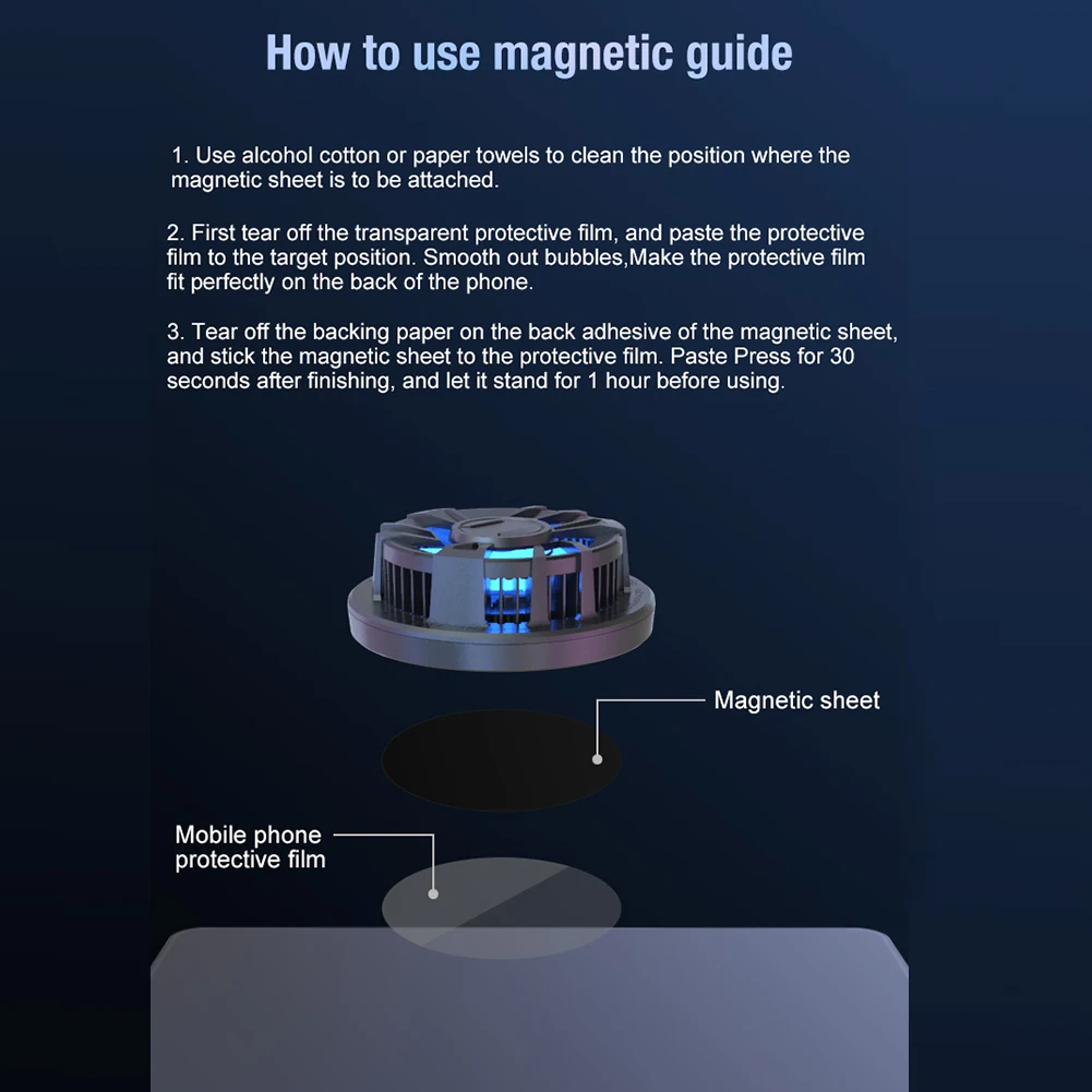 Советы: мобильные телефоны без Apple 12 должны использовать лист магнетизма, сначала Наклейте лист магнетизма на заднюю часть телефона. Затем Прикрепите радиатор к магнитному листу.