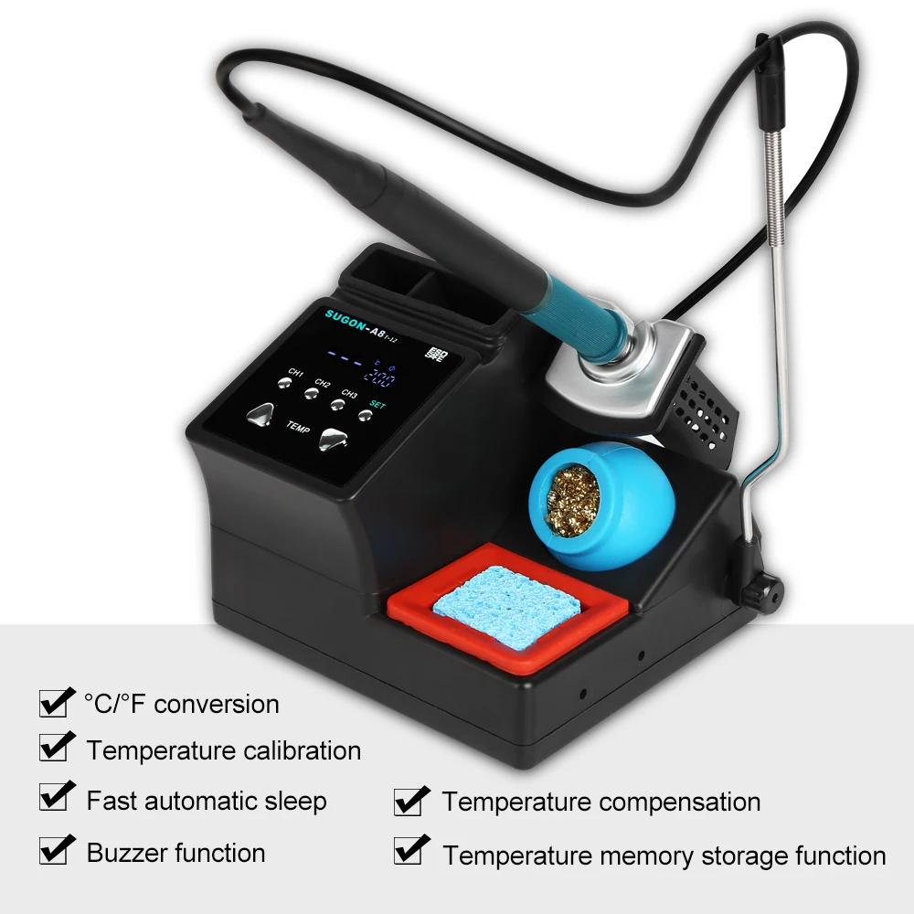 SUGON A8-это умная паяльная станция, совместимая с ручками t12. Ручка имеет спящее металлическое кольцо. Когда ручка вставлена в подставку, она автоматически переходит в спящий режим. Паяльная станция оснащена тремя наконечниками паяльника (I, is, K). Температура паяльной станции контролируется с помощью программы чипа, которая отличается от традиционной паяльной станции с использованием переменного напряжения для контроля температуры, а скорость нагрева быстрая и точная.