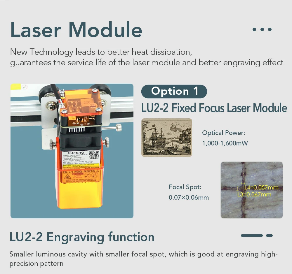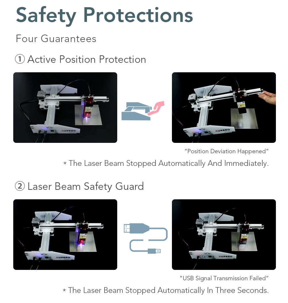 [Общая Оптимизация] Aufero имеет более длительный срок службы, потому что механическая структура была оптимизирована и разработана для высокой точности гравировки в течение длительного времени. В то же время, Aufero может предоставить пользователям больше безопасности, потому что он имеет больше функций безопасности.
