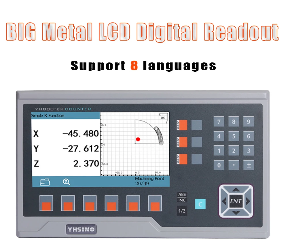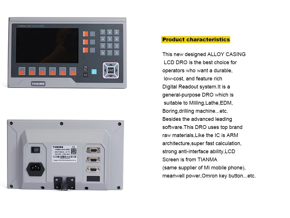 Технические параметры:Количество осей: 1 Ось, 2 оси.3 оси. 4 оси 5 осейРассеивание мощности: 15 ВтДиапазон напряжения: AC80V-260V / 50 Гц-60 ГцРабочая клавиатура: Механическая клавиатураВходной сигнал: 5 в TTL или 5 В RS422Входная частота: ≤ 4 МГцРазрешение поддерживается для линейный энкодер: 0,1 м. 0,2 мкм. 0,5 мкм. 1 м. 2 вечера. 2,5 мкм. 5 мкм. 10 мРазрешение для роторного кодировщика: <1000000 PPRОсобенности:•7 "цветной ЖК-экран, Корпус для литья под давлением. Легко распознать и очень прочный. Настоящее промышленное качество.• Встроенная функция помощи, Освободите руки от ручного использования бумаги• Отображение текущего положения инструмента и предварительный просмотр чертежей.• 34-бит основной чип, 64M Бег памяти, высокой степенью интеграции. Система анти-помех.• Функция сенсорного щупа, очень удобно измерять работу.• Динамическое отображение напоминания (цвет или зум: перемещаемая ось становится больше или другой цвет)• Электронные компоненты высшего бренда обеспечивают длительный срок службыМногосистемный язык (Упрощенный китайский, традиционный китайский, тайский, русский, украинский, венгерский, английский, итальянский, полисаХарактеристики продукта:Этот новый designedALLOYCASING LCD DRO является лучшим выбором для операторов, которые хотят прочный недорогой, и имеет богатыйYHSINO цифровая система индикации. Это общего назначения DRO, который подходит для фрезерования токарного станка, EDM, бурения... и т. Д. Помимо передового ведущего программного обеспечения, DRO использует Лидирующий бренд сырья, например ICis ARM architecturesuper fast calculationStronganti-interface abilityLCD экран от TIANMA (тот же поставщик Ml мобильный телефон) meanwell powerOmron keybutton .. и т. Д.Функция:Обнуление, восстановление данныхПредустановленное значениеМетрический и имперский переключательПамять отключения питанияВыбор датчика (линейный или поворотный)Линейная компенсация и Нелинейная компенсацияНастройка направления подсчетаКоордината ABS/INC200 комплектов координат SDMФункция REFЦентрирование/1/2PLDPCDГладкий RПростой RПреобразование радиуса и диаметраОсь суммированияИзмерение конусностиФункция EDM16 наборов смещения инструментаИнтерфейс RS232Функция векторного управленияДинамическое Масштабирование/цветопередача (цвет или зум: ось, которая перемещается, становится больше или другой цвет)Отображение скорости подачи в реальном времениИзмерение скорости вращенияЛинейный измерительный энкодерРасстояние до путиФункция осциллографа3D сенсорный зонд (измерение круга, измерение расстояния на основе проекции, измерение пересечений двух линий)Настройка системы:Вся информация отображается без путаницы. Очень легко установить. Кроме того, система поддерживает упрощенный китайский, традиционный китайский, тайский, русский, украинский, венгерский, английский, итальянский, польский.Встроенное руководство:При возникновении каких-либо сомнений в любом процессе нажмите кнопку HELP. Система объяснит, как установить этот процесс. Например, если DRO находится в функции отверстия болта, нажмите кнопку помощи, система объяснит, как установить функцию отверстия болтаДинамический зум:Как только любая перемещаемая ось становится больше или другой цвет, чтобы напомнить оператору.Функции PCD:Система отобразит чертеж, как только параметр будет установлен хорошо. Он также поддерживает Отображение текущего положения инструмента (крас