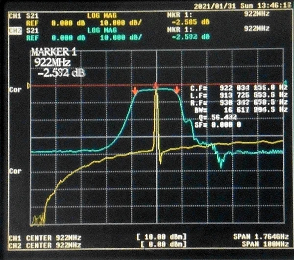 \Диаграмма частотного отклика (отмечена как полоса пропускания 3 дБ, частота сканирующего центра: 922 МГц, ширина синей линии развертки: 100 МГц, ширина желтой линии развертки: 1764 МГц, вертикальное разрешение: каждый ГРИД 10 дБ):