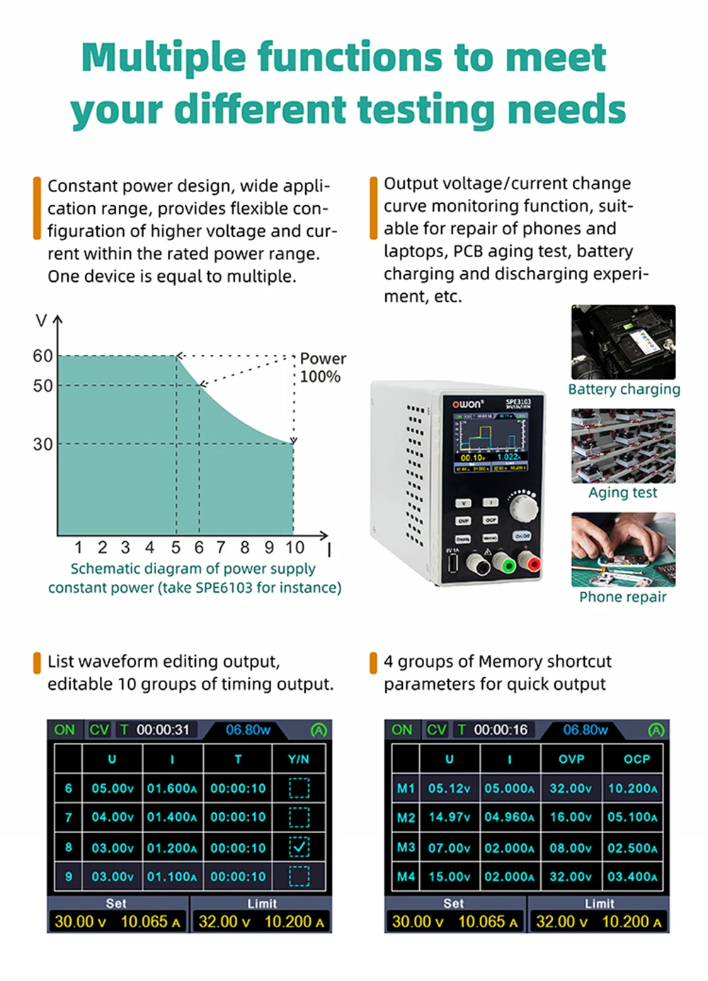 OWON SPE3051 программируемый источник питания постоянного тока 30 в 5A 150 Вт 2,8 дюймов LCD 10 мВ/1мА разрешение цифровое переключение регулятора напряжения питания