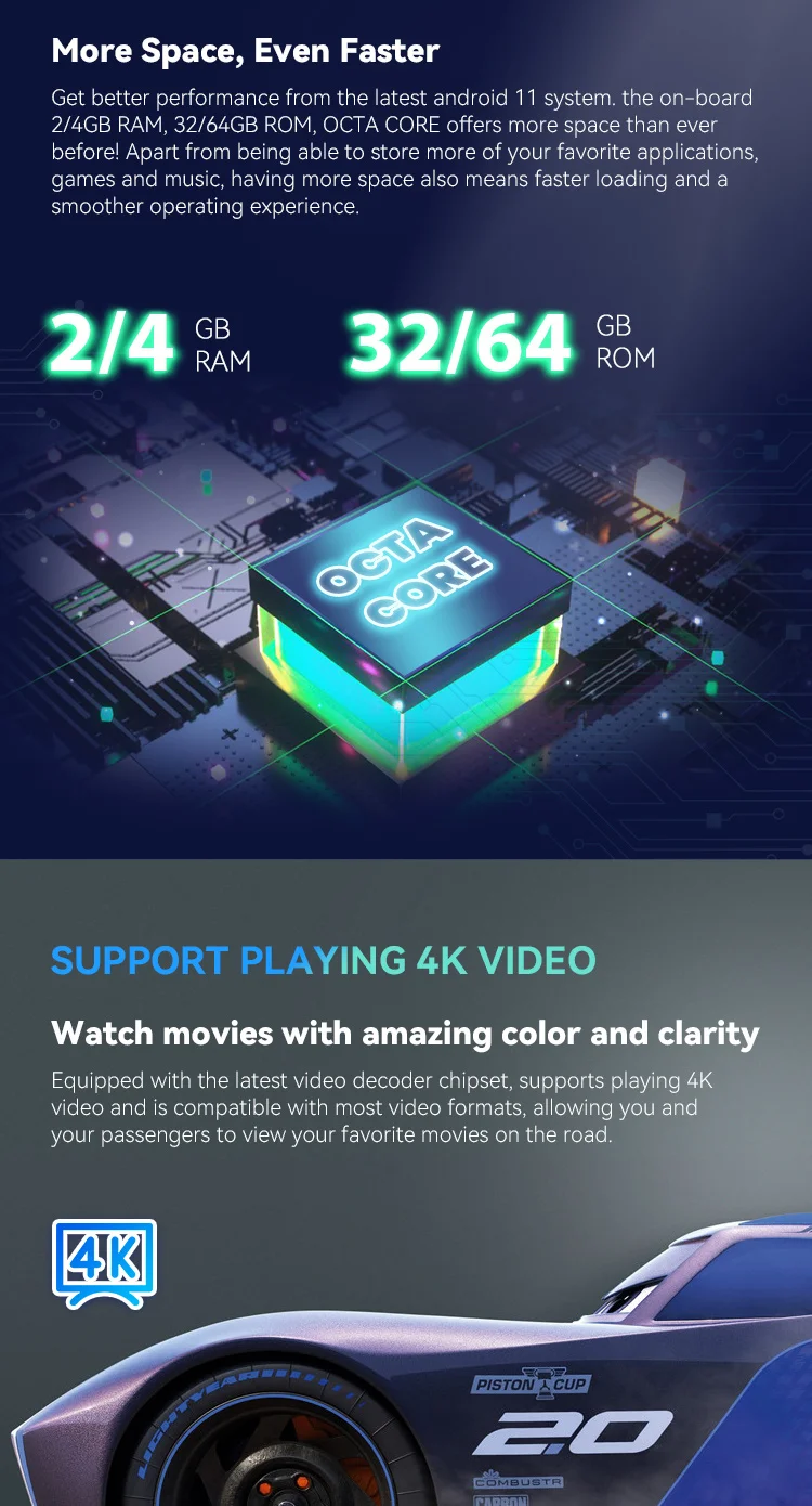 Оперативная память2G/4GВстроенная память32 г/64 гИнтернетВстроенный Wifi moudle и 4G LTE, можно вставить 4G sim-карты напрямуюПрименениеБесплатное приложение Plentifitul, Google playВидеорегистраторВстроенная Автомобильная DVR программа (Работает С опциональной USB DVR камерой)ПоддержкаBT/DSP/RDS/FM/PIP/Slipt экран и т. Д.ВстроенныйПроводной Carplay/беспроводной carplay/Android autoПоддержкаAHD камераДополнительная функцияКамера заднего вида