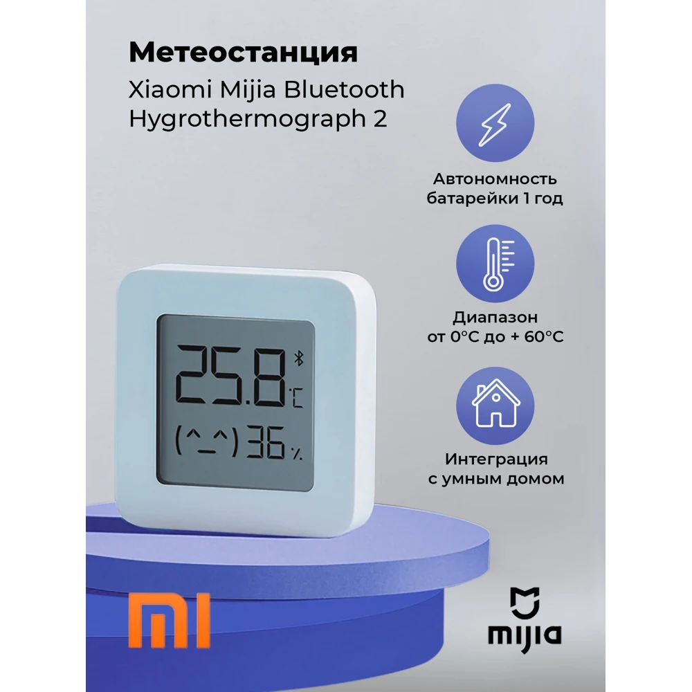 "Современный термогигрометр с модулем Bluetooth для передачи данных на смартфон. Датчик позволяет измерять температуру с точностью до 0.1°C и влажность с точностью до 1%. Показания можно просматривать не только на встроенном экране, но и со смартфона через приложение. Кроме того, можно настроить автоматическое включение/выключение кондиционера или обогревателя в зависимости от температуры в помещении. Или, например, автоматически активировать увлажнитель воздуха. Устройство получило монохромный дисплей квадратной формы. В качестве питания используется батарейка-таблетка CR2032.