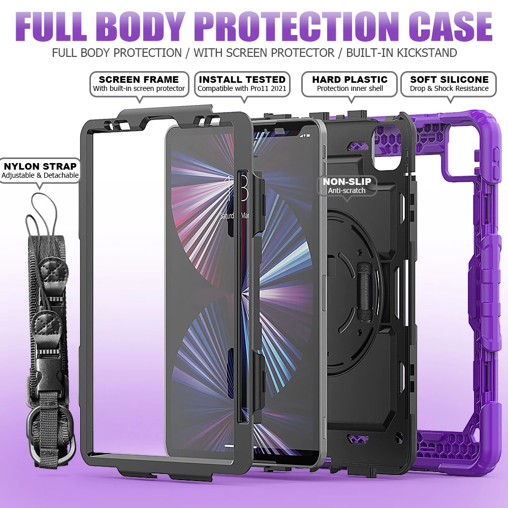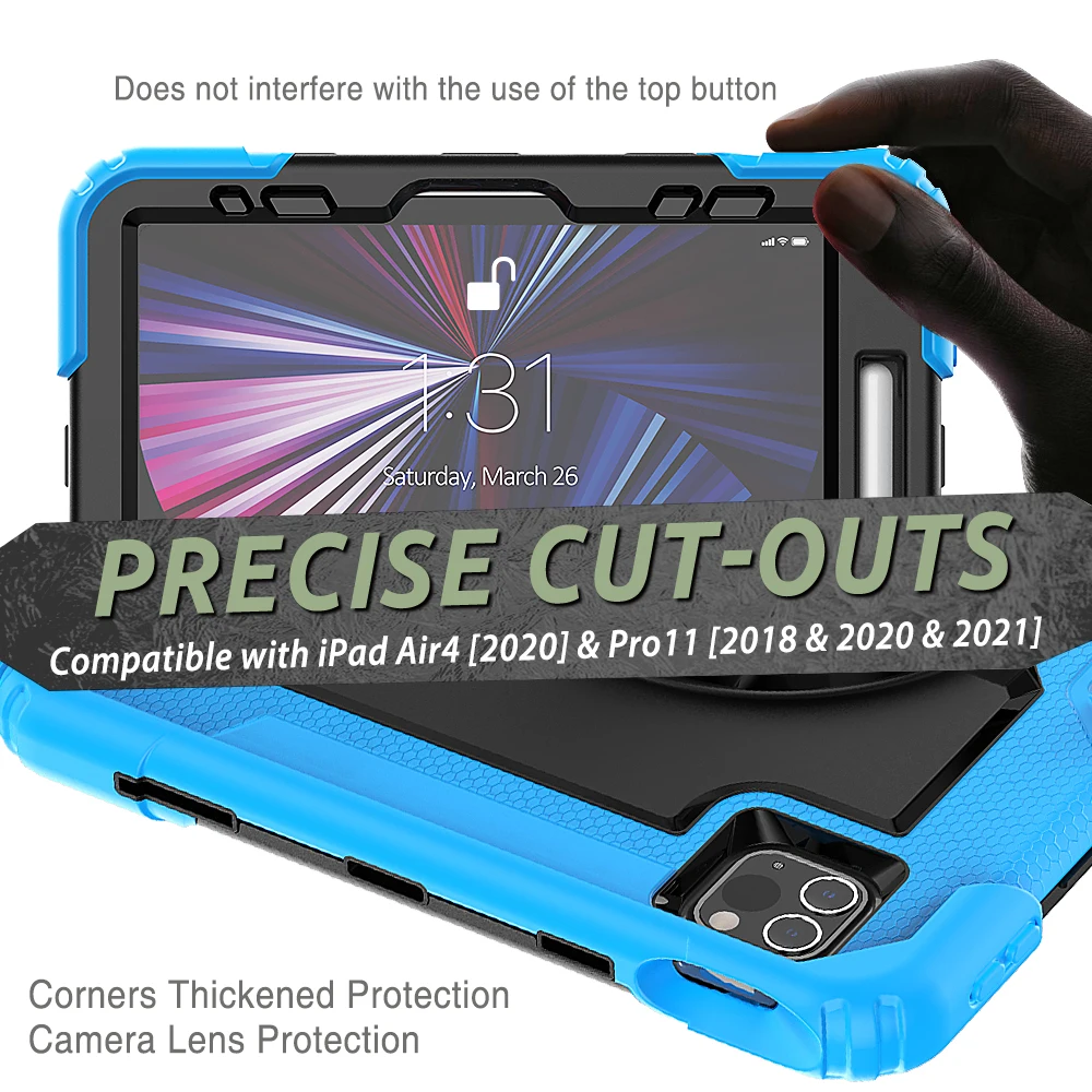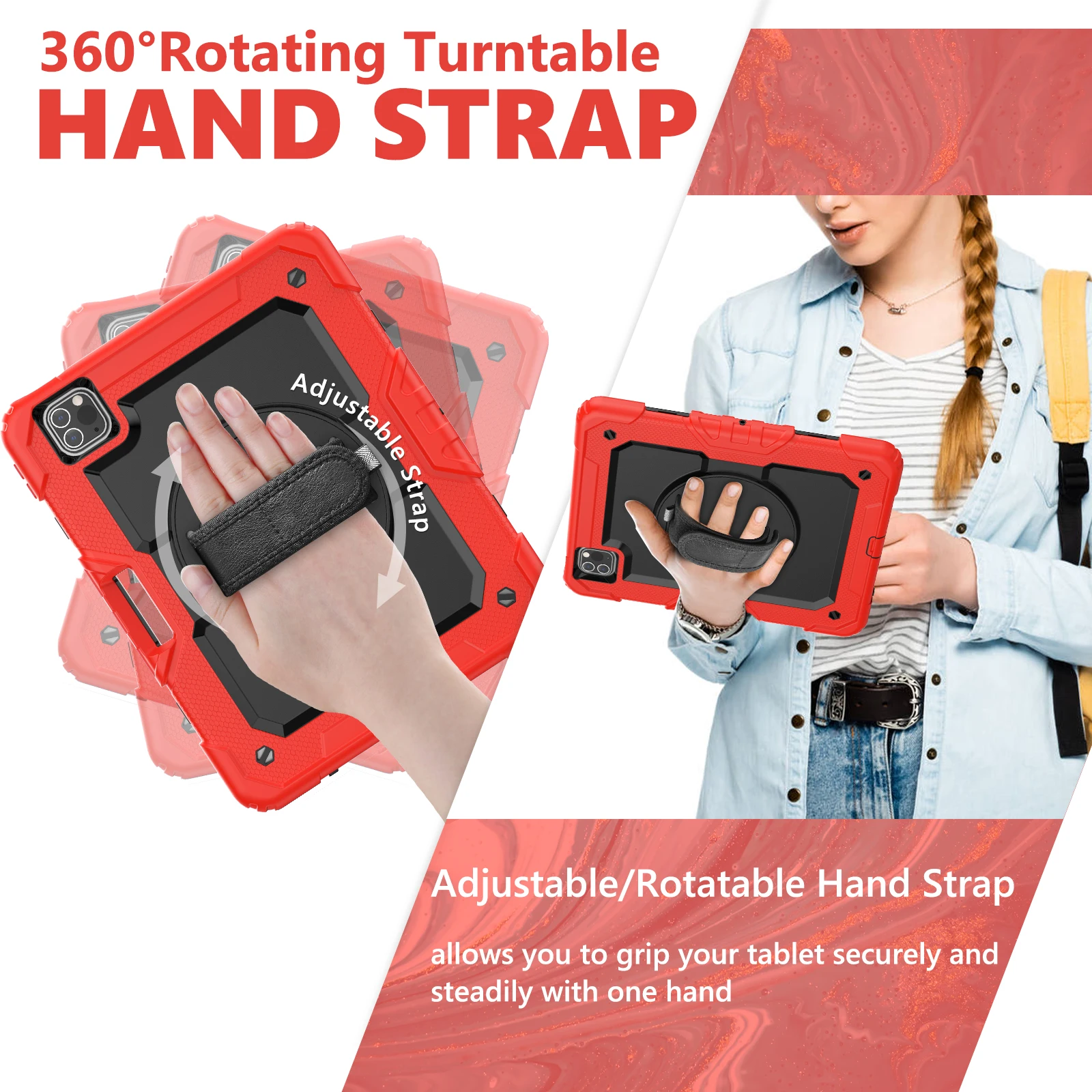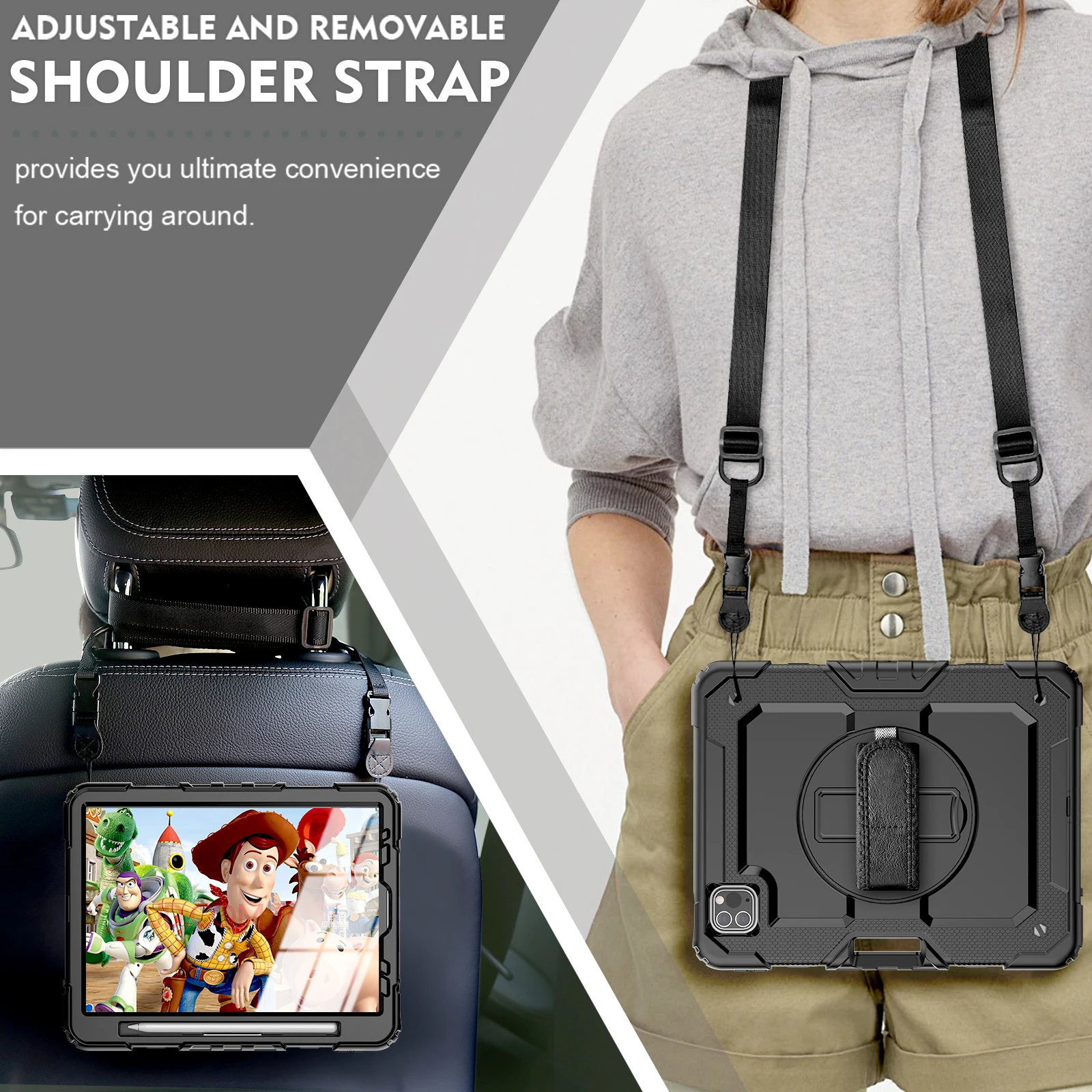 -Встроенная откидная подставка на 360 ° и регулируемый ремешок для рук и регулируемый плечевой ремень для множества возможностей, Удлинительный ремешок помещается на спине, чтобы разместить карандаш Apple.
