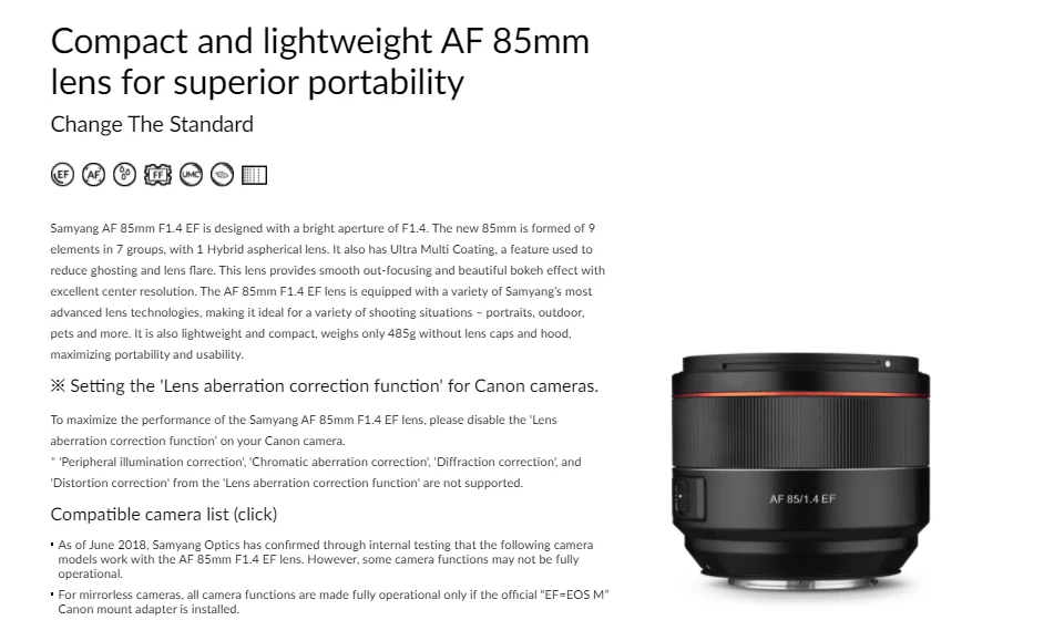 Смешивание фокусного расстояния с быстрым дизайном,Samyang AF 85 мм f/1,4 EFОбъектив Canon EF-mount хорошо подходит для портретной съемки. Его яркая максимальная диафрагма f/1,4 обеспечивает широкий контроль над глубиной поля для использования селективного фокуса, а также превосходит светильник в условиях низкой освещенности. Оптическая конструкция имеет Гибридный асферический элемент, который контролирует искажения и сферические аберрации для получения большей четкости и четкости во всем диапазоне диафрагмы. Отдельные элементы также обладают ультрамногослойным покрытием для подавления бликов и привидения для улучшения контрастности в различных условиях освещения. Преимущество оптики, объектив также имеет Ультразвуковой Двойной линейный электродвигатель для автофокуса для быстрой и точной фокусировки. Кроме того, закругленная диафрагма с девятью лезвиями помогает достичь приятного качества боке.