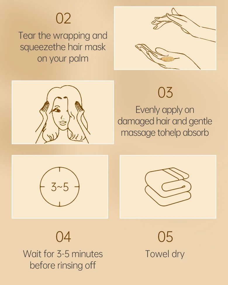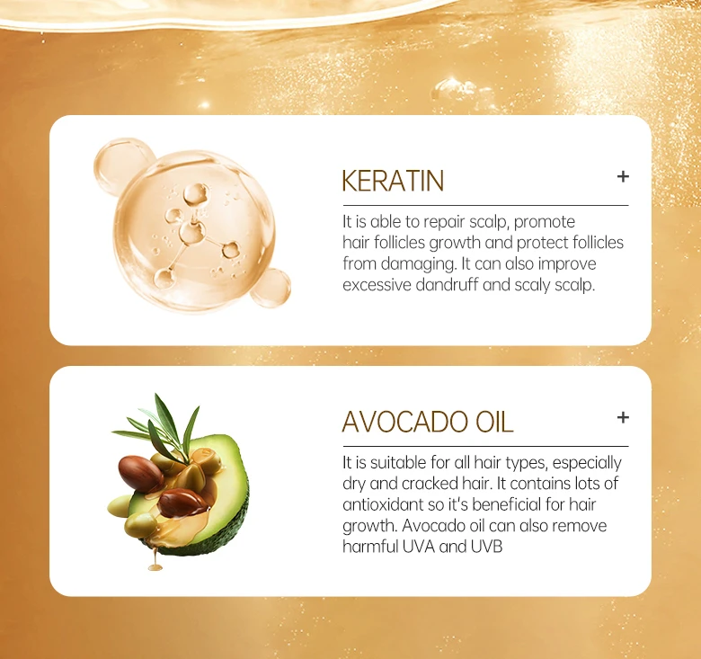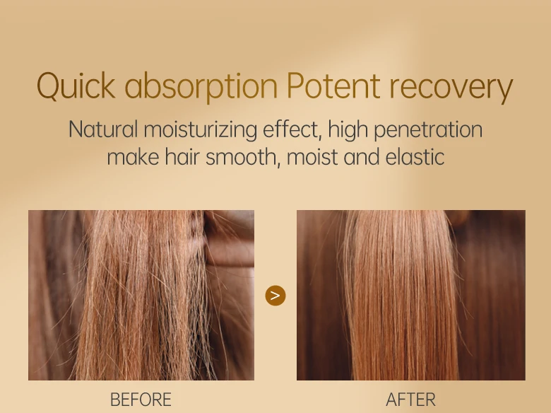 Кератин является важным компонентом для роста волос, и он высоко концентрируется в каждой грануле в кератиновой терапии Маска для волос. Во время пребывания на волосах эта маска для волос может пополнять питание, чтобы заполнить empties и трещины, вызванные внешними повреждениями, такими как сухая и Загрязненная среда, солнце подвергать или частые укладки, улучшение хрупких волос и уменьшение ломкости волос. Впитывая достаточно коллагена для роста, волосы станут крепкими и эластичными с большей блеском и меньшим секущимся концом.