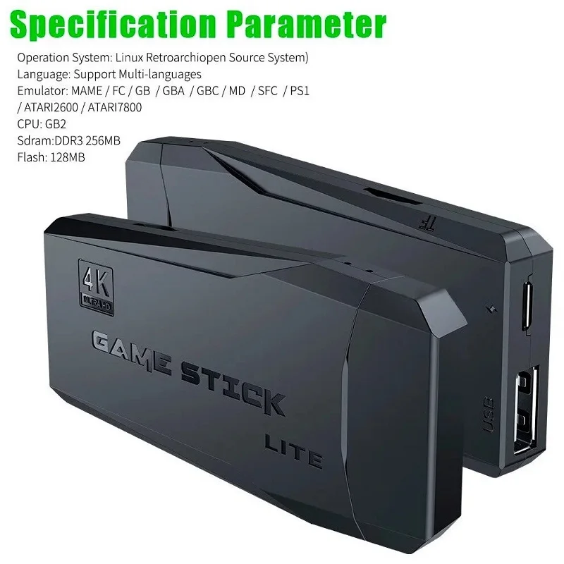 Эта игровая консоль использует интерфейс HDMI вместо интерфейса USB, вы можете подключить ее к телевизорам, компьютерным мониторам, проекторам с интерфейсом HDMI. Поддержка разрешения через HDMI до 4K! Два беспроводных геймпада 2.4G уже в комплекте. Игровая консоль поддерживает одного или двух игроков, имеет множество встроенных ретро-классических игр, 3550 и 10000 версий игр. Поддержка более 40 игровых форматов: PS1, ATARI, MAME, forSFC, FC, GBA, GB, GBC, MD и другие. Поддерживает самостоятельную установку игр. Для выхода в меню необходимо нажать сочетание клавиш START+SELECT одновременно.