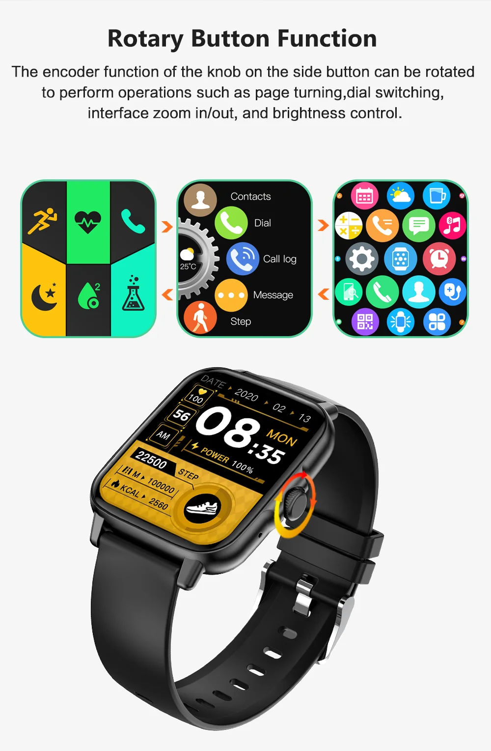 Multi-function NFC custom wallpaper. BT call, music control social APP message alert, call alert, SMS alert, HEART rate/blood pressure/blood oxygen monitoring, exercise more, alarm alarm, sedentary alert, mobile phone search, music play, stopwatch. Calculator, casual games