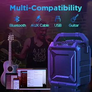 Беспроводной динамик с несколькими аудиовыходами, может использоваться как телевизор, компьютеры, ноутбуки или другие устройства аудиовыход. Вход aux/USB/guitar включен для устройств без Bluetooth.