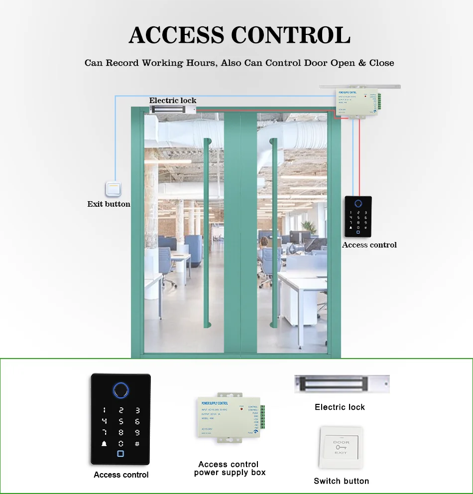 Посылка включает в себя: кнопочную панель управления доступом + блок питания + Электрический магнитный замок 180 кг + пластиковый переключатель + брелоки 10 шт.