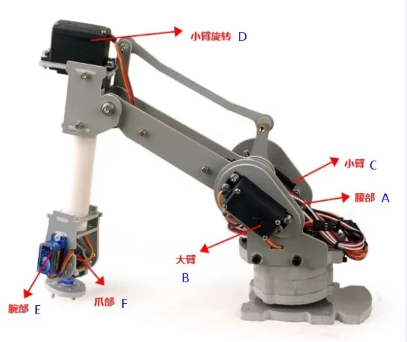 Шесть степеней свободы манипулятора следующие: A: талия 0-180 градусов B: предплечье и предплечье взаимодействуют друг с другом, и диапазон угла вращения переменный C: предплечье И предплечье взаимодействуют друг с другом, и диапазон угла вращения переменный D: предплечье вращение 0-180 градусов E: Запястье 0-180 градусов F: лапа 0-180 градусов