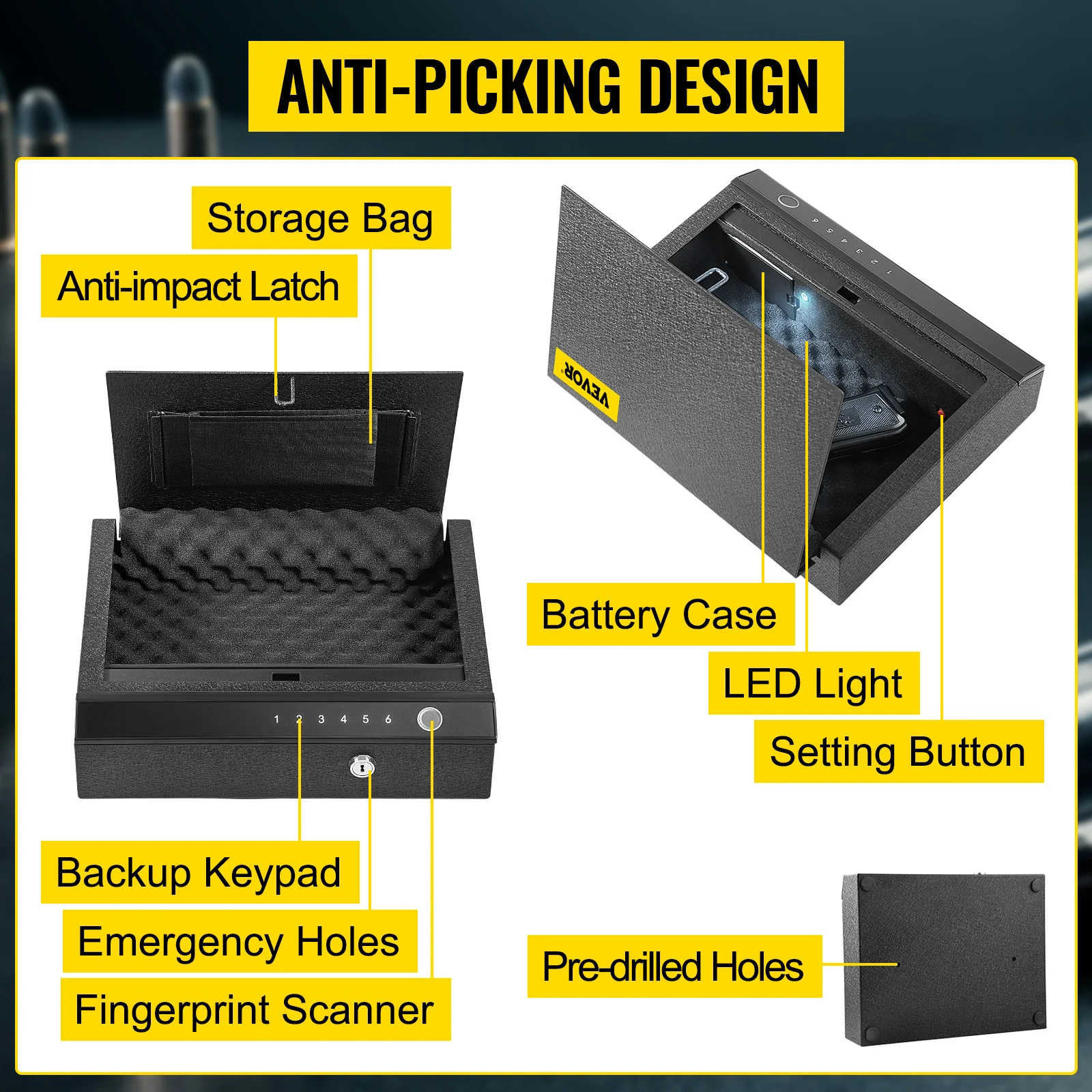 Настольный Сейф изготовлен из твердой стали и имеет защищенную от взлома дверь для обеспечения прочности и безопасности пистолета. Он также использует высокоточную технологию безопасности и антиударную защелку, чтобы предотвратить принудительное открытие.