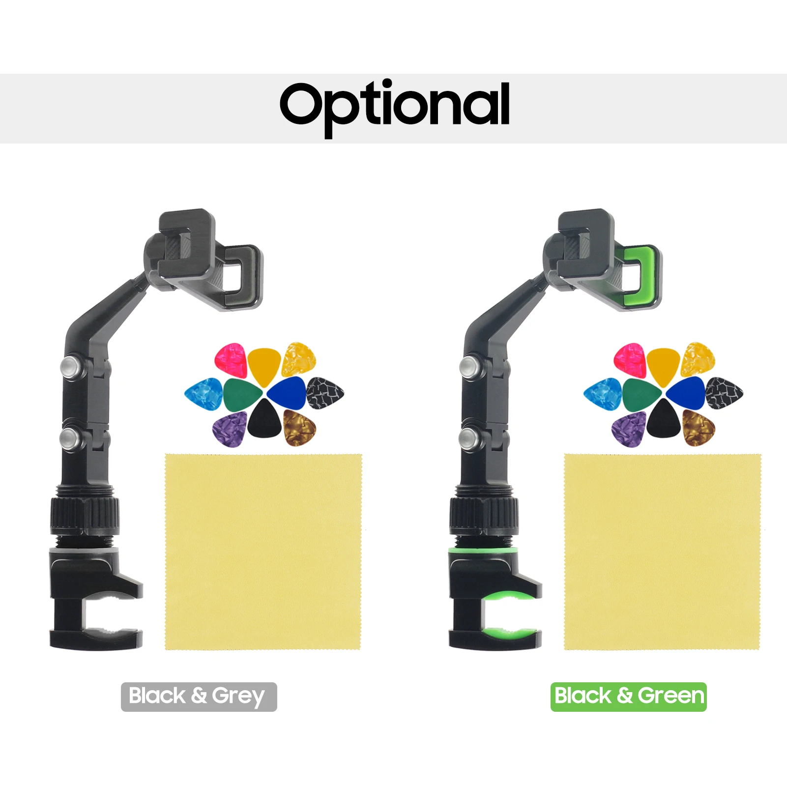 Это многофункциональный держатель для телефона, который используется для записи видео, просмотра текста, потоковой передачи в реальном времени, обучения просмотру видео и многого другого. Он регулируется и вращается, очень гибкий, чтобы быть зажатым в любом месте вы хотите. Кроме того, в посылка входит 10 штук гитарной палочки и протирочная ткань.
