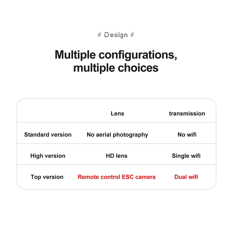 Camera: NO camera/ESC 1080P(single camera) /ESC 4K(single camera) /ESC 4Kpro (dual camera)