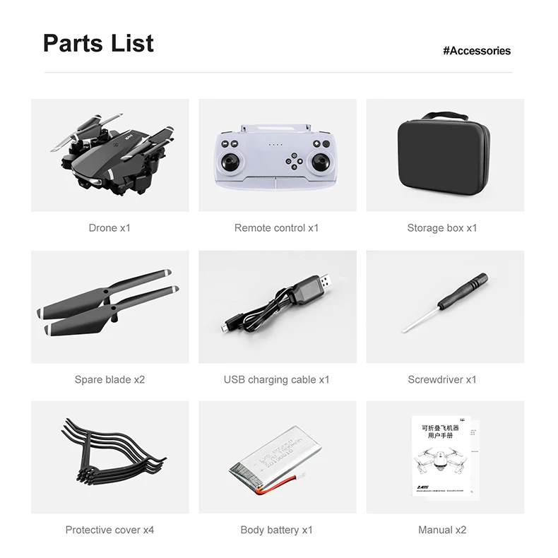 Functions: up/down, forward/backward, left/right, side flight, three-level flight speed, LED lights, headless mode, one-key automatic return, altitude hold mode, WiFi FPV, trajectory flight, Camera/video