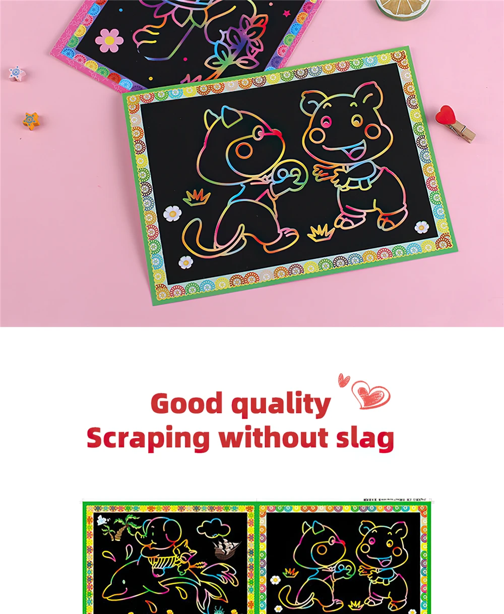 Features:the card has two sides. one side for scraping, another side for coloring.