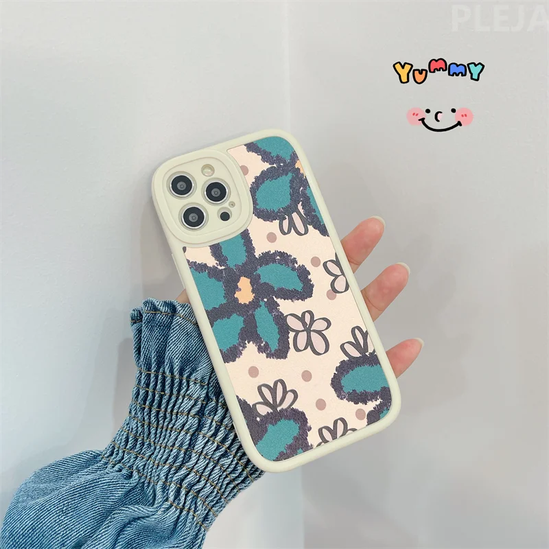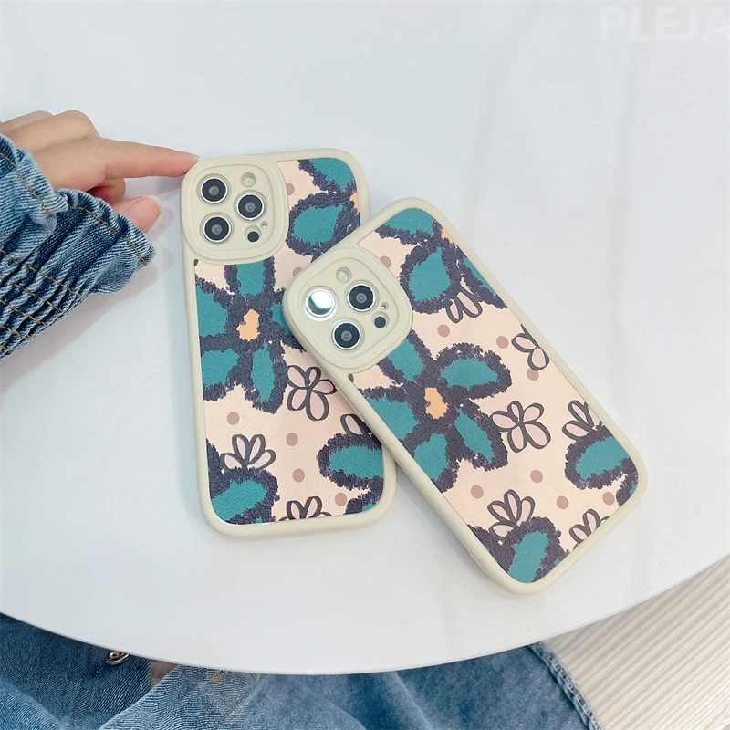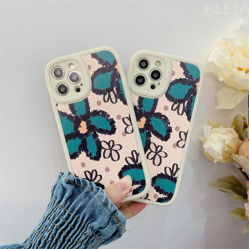 Кожаный чехол для iPhone 13 Pro 12 11 Pro Max 7 8 Plus X XR XS Max в стиле ретро с масляными красками и зелеными цветами, мягкие милые чехлы