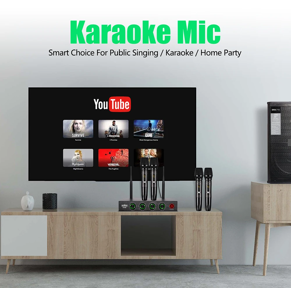 【Улучшенная стабилизация сигнала 】-50 выбираемых каналов на микрофон, 4 микрофона всего 200 каналов, Дальний диапазон передачи 200 футов (60 м) в открытом пространстве, обеспечивая одновременное использование до 5 комплектов, не беспокоясь о помехах.