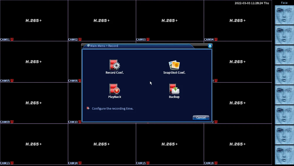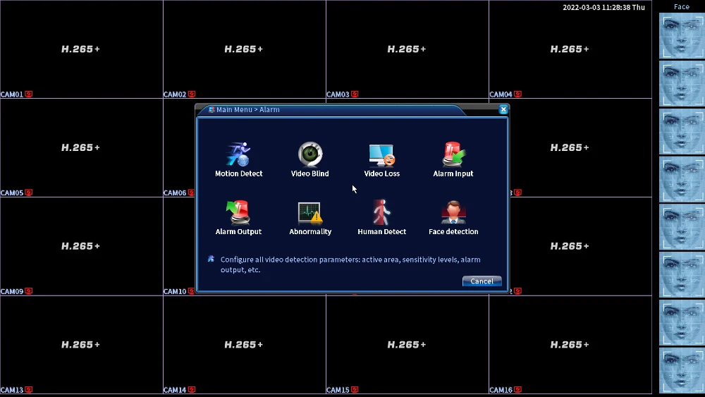 ДвижениеОбнаружениеКаждый экран может быть установлен на 192 (16*12) зоны обнаружения;Многоуровневая Чувствительность может быть установлена(Ограниченный местный канал)Режим записиРуководство> Сигнализация> Динамическое Обнаружение> ВремяАудио