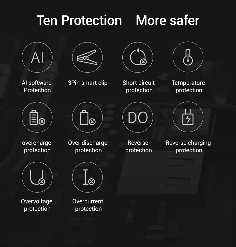 -Восемь защитных смарт-зажимов: защита от короткого замыкания, защита от перенапряжения, защита от перегрузки по току, защита от перезарядки,