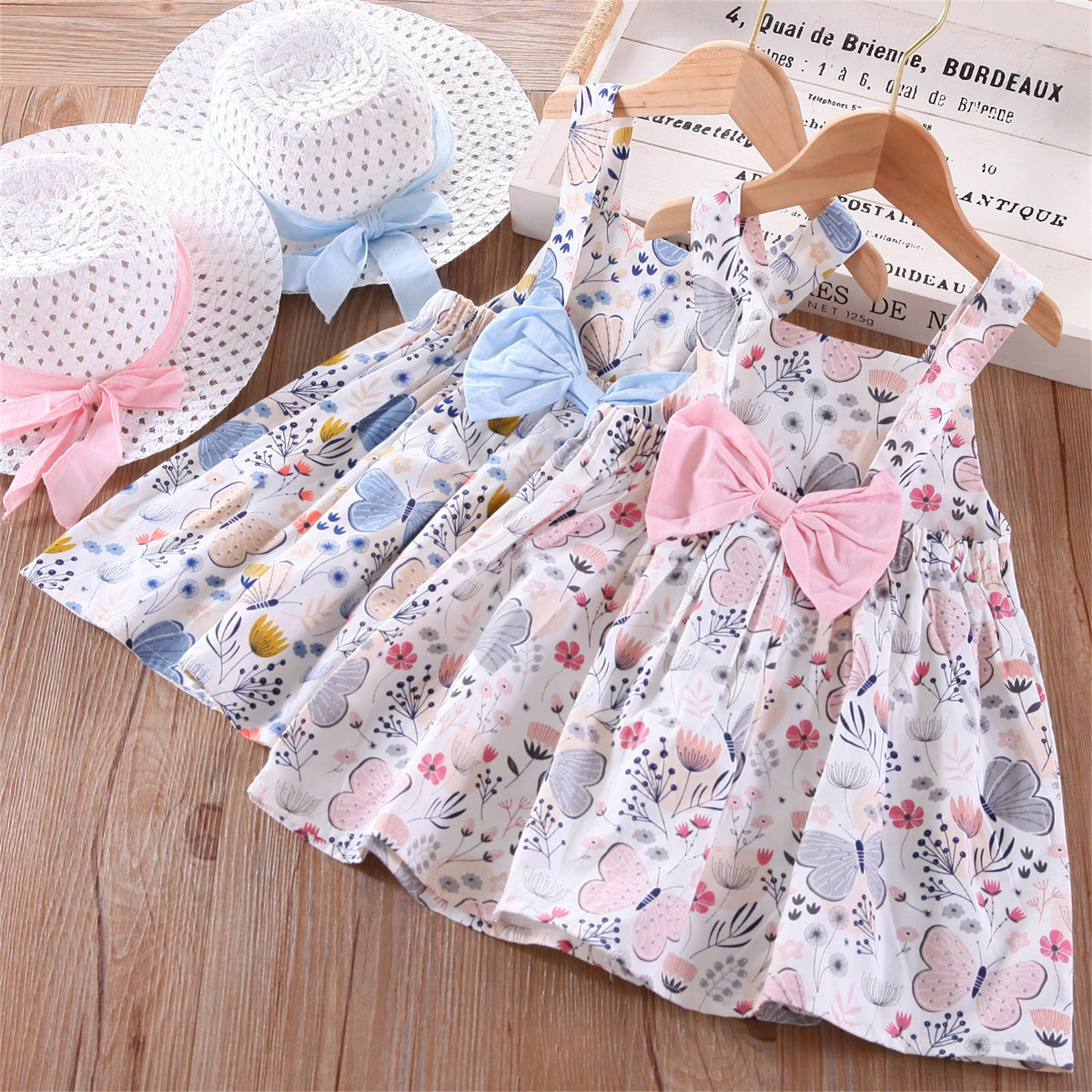 Летние платья принцессы для маленьких девочек; Комплект для отпуска в стиле бохо без рукавов с шапкой; Платье с цветочным рисунком и оборками и бантом