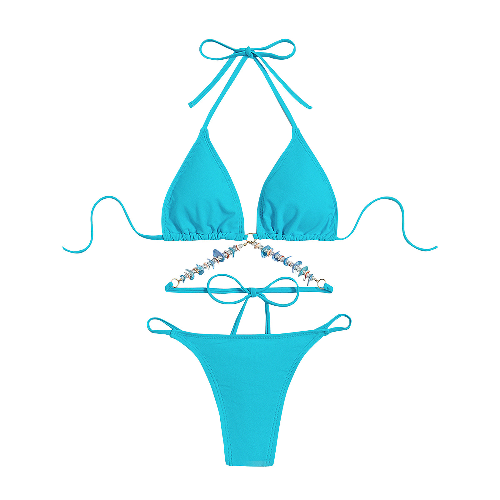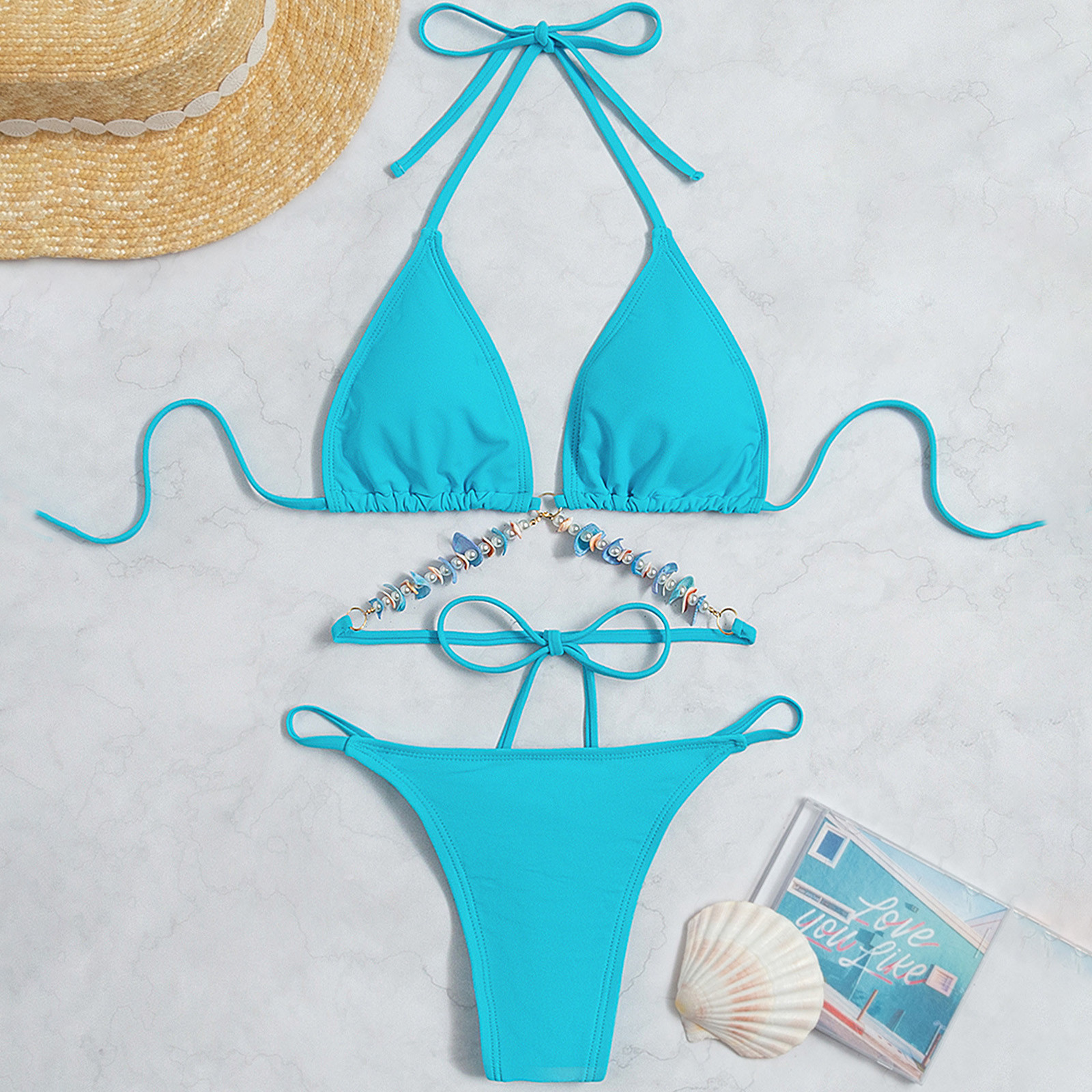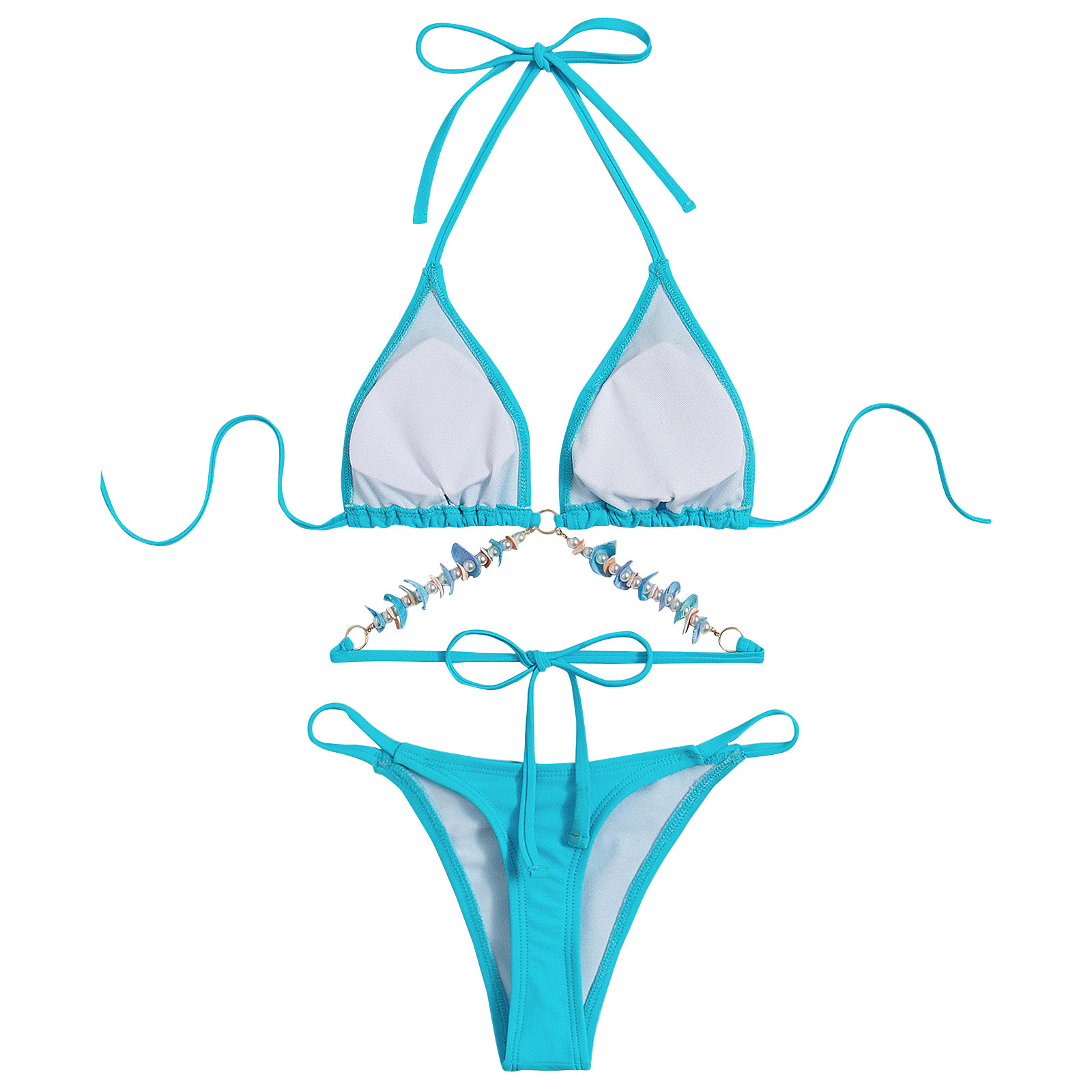 Женский летний модный сексуальный однотонный купальник-бикини с блестками и жемчужной цепочкой, на шнуровке, с бретельками через шею