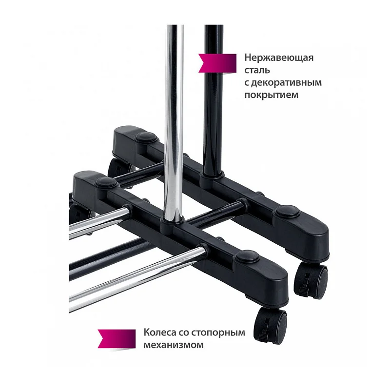 Колеса со стопорным механизмом обеспечивают легкое перемещение, а также возможность надежно зафиксировать вешалку в выбранном месте