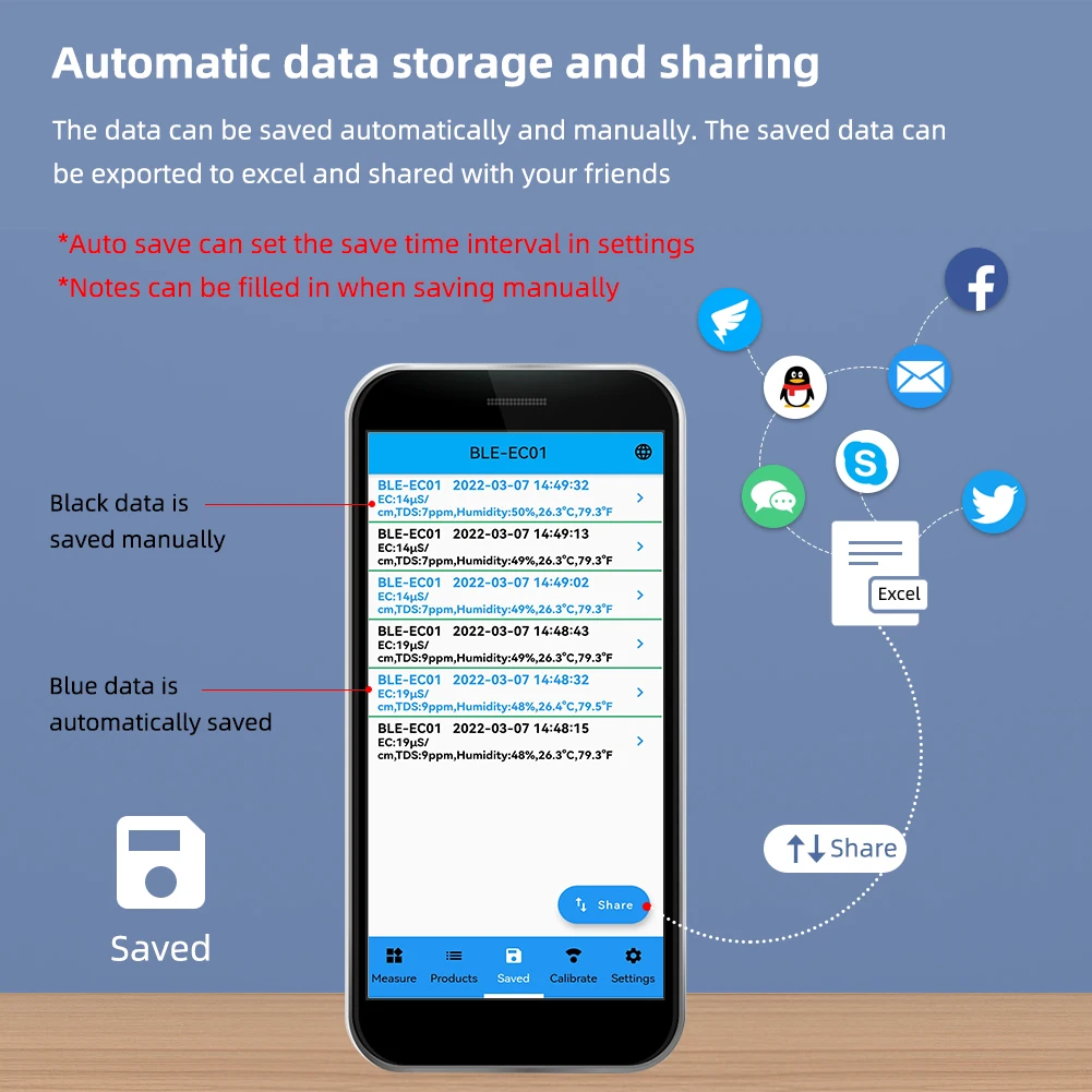 1. Одна страница отображает 5 элементов данных одновременно, что удобно и быстро считывает данные.2. Мобильный телефон приложение контролирует подсветку или нет подсветки3. Отображать процент батареи4. Данные могут храниться или сохраняться, и после сохранения, они могут быть экспортированы в виде листа EXCEL на компьютер или мобильный телефон, и печать поддерживается.5. Включите автоматическое сохранение, и данные будут сохранены каждые 30 секунд.6. Диапазон температуры EC TDS RH может быть установлен свободно, если диапазон превышен, он может быть предложен7, есть английские и китайские иероглифы, которые могут быть свободно переключены