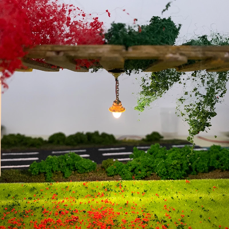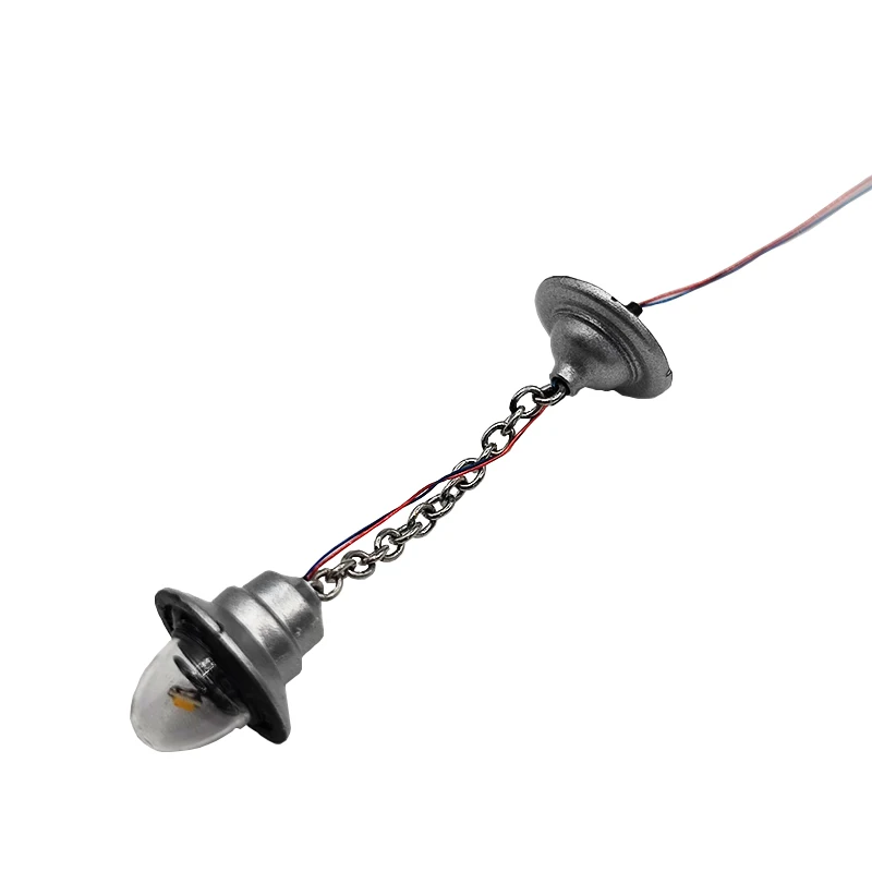 Абажур из высококачественного прозрачного пластика, люстра из металлического материала, цепочка люстры может регулировать длину, светильник теплый белый, люстра серебристая, внешний вид очень реалистичный. Подходит для модели сценариев таблицы песка 1:64 или 1:87.