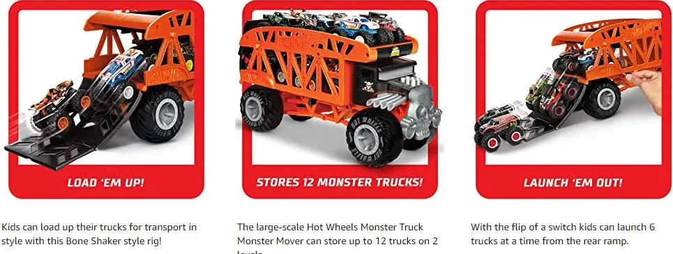 Дети могут транспортировать свои горячие колеса Монстр грузовики в стиле с монстром Mover.