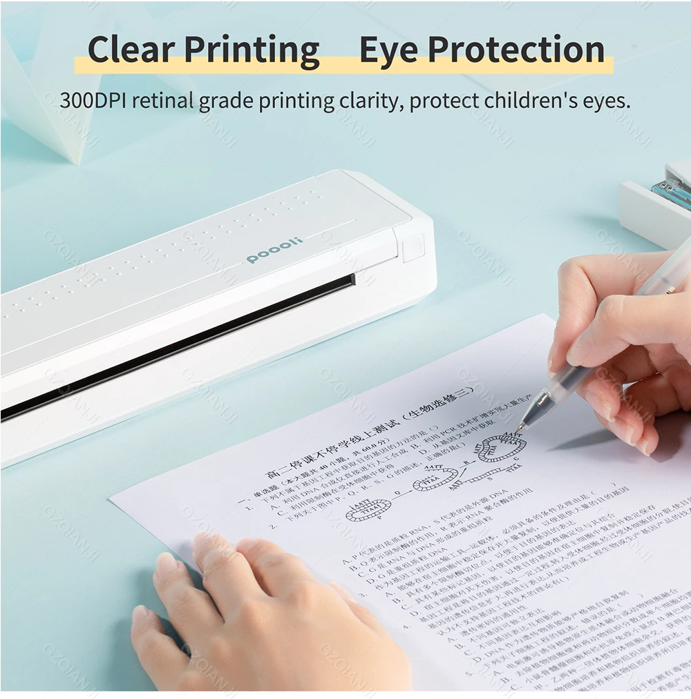 А4 портативный принтер: Маленький и легкий, легко носить с собой, печатать в любое время и в любом месте. Разрешение 300 точек/дюйм, передовая технология термопередачи, четкий почерк и хороший эффект печати.